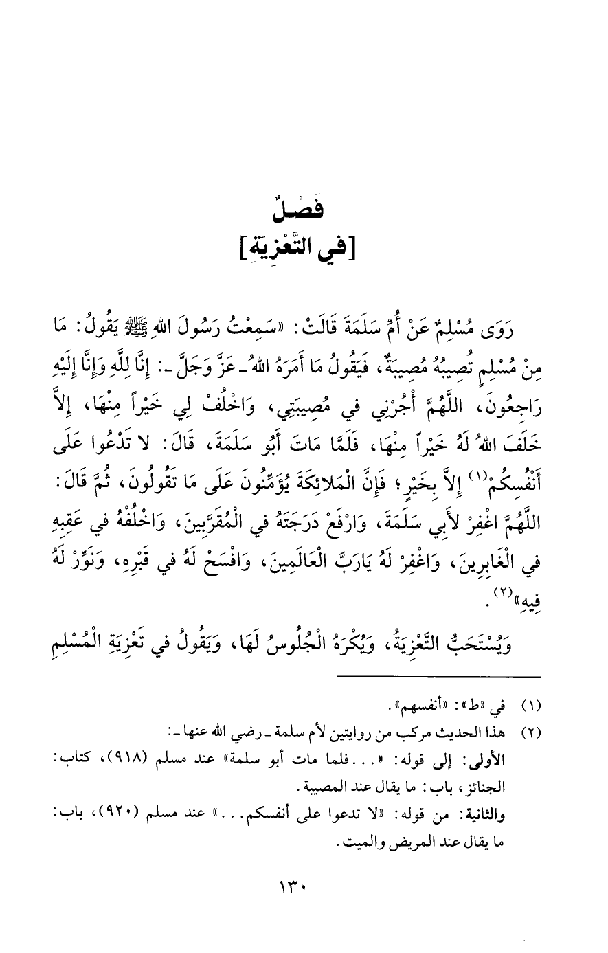 رَوَى مُسْلِمٌ عَنْ أُمِّ سَلَمَةَ قَالَتْ: "سَمِعْتُ رَسُولَ اللهِ - صلى الله عليه وسلم - يَقُولُ: مَا مِنْ مُسْلِمٍ تُصِيبُهُ مُصِيبَةٌ، فَيَقُولُ مَا أَمَرَهُ الله - عَزَّ وَجَلَّ-: إِنَّا لِلَّهِ وَإِنَّا إِلَيْهِ رَاجِعُونَ، اللَّهُمَّ أْجُرْنِي فِي مُصِيبَتِي، وَاخْلُفْ لِي خَيْراً مِنْهَا، إِلَّا خَلَفَ اللهُ لَهُ خَيْراً مِنْهَا، فَلَمَّا مَاتَ أَبُو سَلَمَةَ، قَالَ: لا تَدْعُوا عَلَى أَنْفُسِكُمْ (¬1) إِلَّا بِخَيْرٍ؛ فَإِنَ الْمَلائِكَةَ يُؤَمِّنُونَ عَلَى مَا تَقُولُونَ، ثُمَّ قَالَ: اللَّهُمَّ اغْفِرْ لأَبِي سَلَمَةَ، وَارْفَعْ دَرَجَتَهُ فِي الْمُقَرَّبِينَ، وَاخْلُفْهُ فِي عَقِبِهِ فِي الْغَابِرِينَ، وَاغْفِرْ لَهُ يَارَبَّ الْعَالَمِينَ، وَافْسَحْ لَهُ فِي قَبْرِهِ، وَنَوِّرْ لَهُ فِيهِ" (¬2).