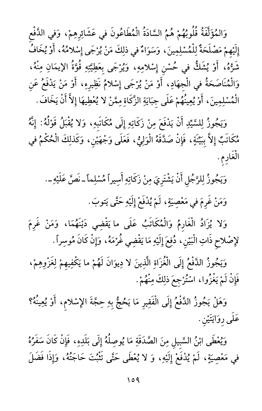 وَالمُؤَلَّفَةُ قُلُوبُهُمْ هُمُ السَّادَةُ الْمُطَاعُونَ فِي عَشَائِرِهِمْ، وَفِي الدَّفْعِ إِلَيْهِمْ مَصْلَحَةٌ لِلْمُسْلِمِينَ، وَسَوَاءٌ فِي ذلِكَ مَنْ يُرْجَى إِسْلامُهُ، أَوْ يُخَافُ شَرُّهُ، أَوْ يُشَكُّ فِي حُسْنِ إِسْلامِهِ، وَيُرْجَى بِعَطِيَّتِهِ قُوَّةُ الإيمَانِ مِنْهُ، وَالْمُنَاصَحَةُ فِي الْجِهَادِ، أَوْ مَنْ يُرْجَى إِسْلامُ نَظِيرِهِ، أَوْ مَنْ يَدْفَعُ عَنِ الْمُسْلِمِينَ، أَوْ يُعِينُهُمْ عَلَى جِبَايَةِ الزَّكَاةِ مِمَّنْ لا يُعْطِيهَا إِلَّا أَنْ يَخَافَ.