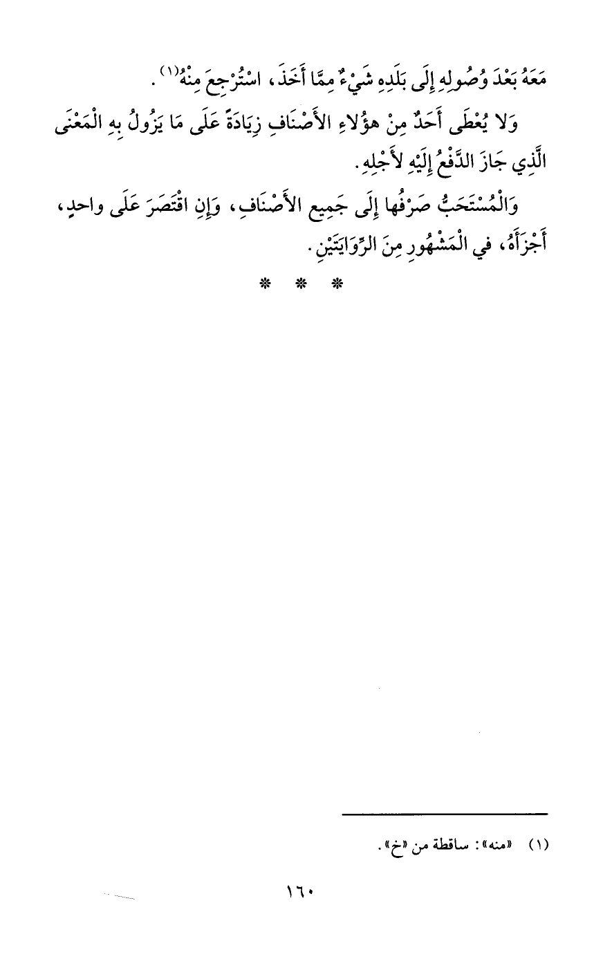 وَالْمُسْتَحَبُّ صَرْفُها إِلَى جَمِيع الأَصْنَافِ، وَإِنِ اقْتَصَرَ عَلَى واحدٍ، أَجْزَأَهُ، فِي الْمَشْهُورِ مِنَ الرِّوَايَتَيْنِ.