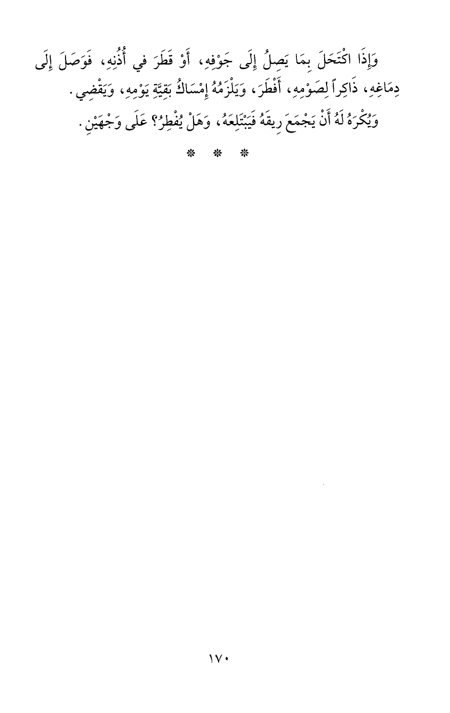 وَإِذَا اكْتَحَلَ بِمَا يَصِلُ إِلَى جَوْفِهِ، أَوْ قَطَرَ فِي أُذُنِهِ، فَوَصَلَ إِلَى دِمَاغِهِ، ذَاكِراً لِصَوْمِهِ، أَفْطَرَ، وَيَلْزَمُهُ إِمْسَاكُ بَقِيَّةِ يَوْمِهِ، وَيَقْضِي.
