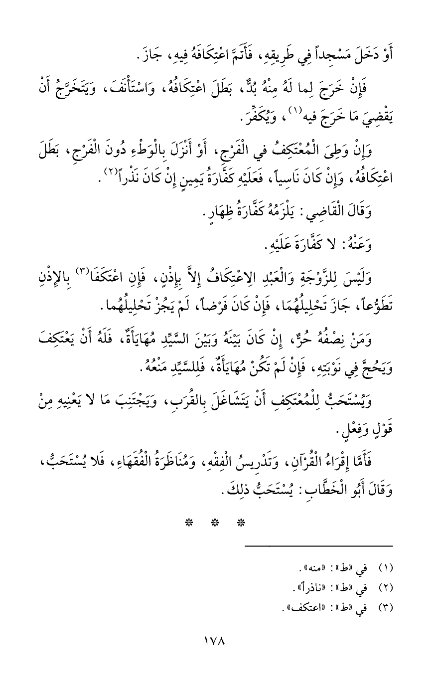 وَإِنْ وَطِىَ الْمُعْتَكِفُ فِي الْفَرْجِ، أَوْ أَنْزَلَ بِالْوَطْءِ دُونَ الْفَرْجِ، بَطَلَ اعْتِكَافُهُ، وَإِنْ كَانَ نَاسِياً، فَعَلَيْهِ كَفَّارَةُ يَمِينٍ إِنْ كَانَ نَذْراً (¬2).