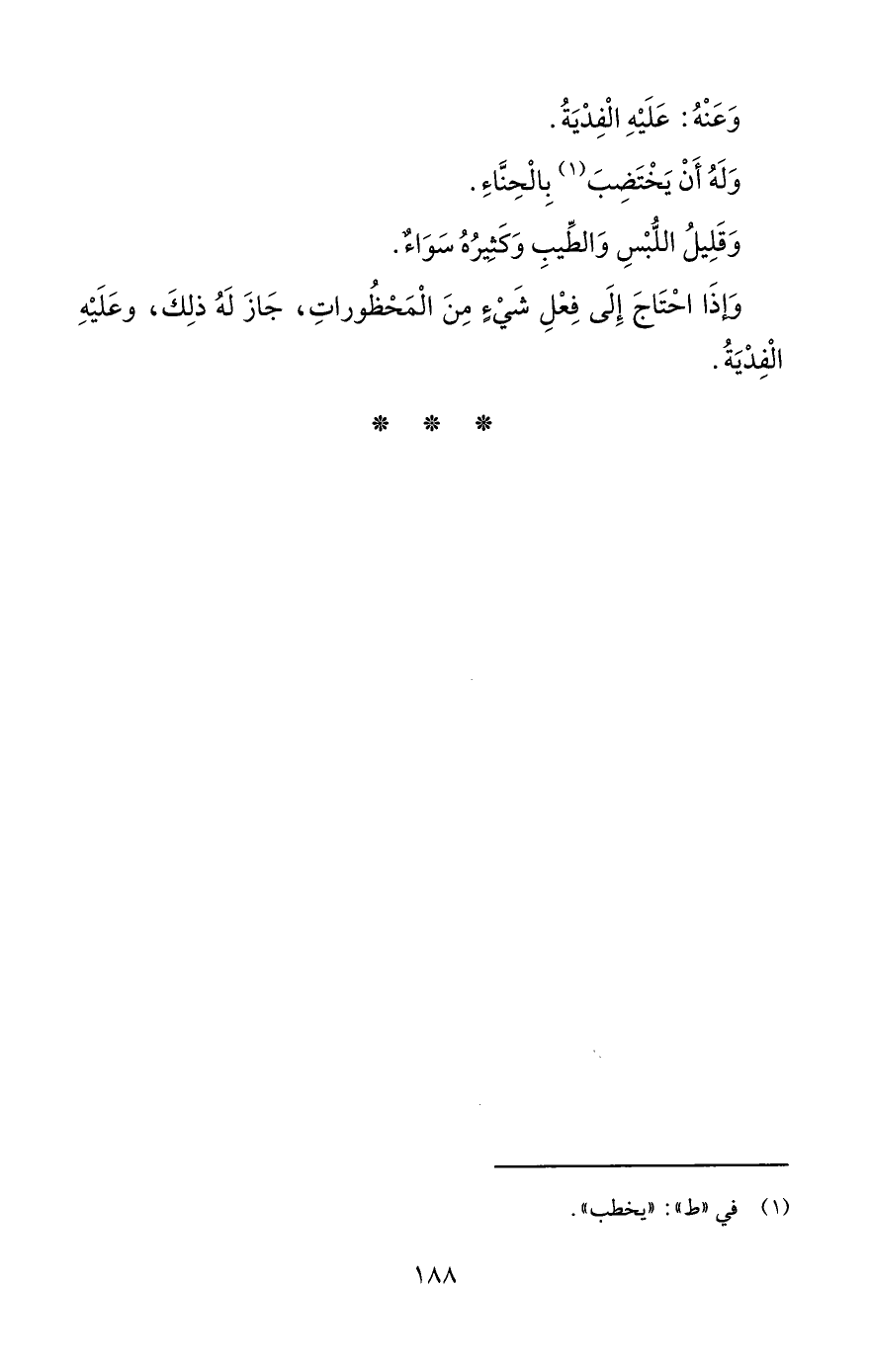 وَإذَا احْتَاجَ إِلَى فِعْلِ شَيْءٍ مِنَ الْمَحْظُوراتِ، جَازَ لَهُ ذلِكَ، وعَلَيْهِ الْفِدْيَةُ.