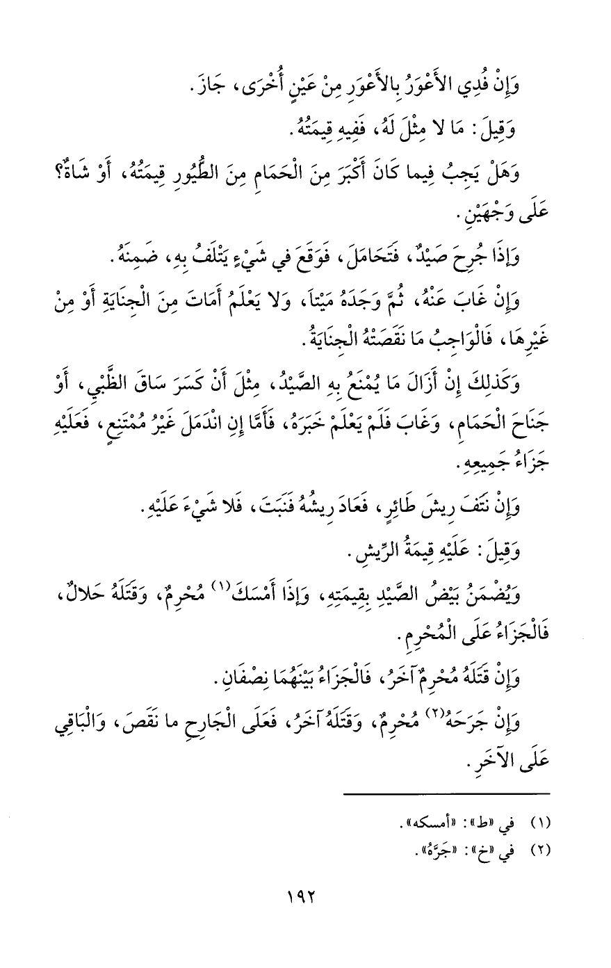 وَكَذلِكَ إِنْ أَزَالَ مَا يُمْنَعُ بِهِ الصَّيْدُ، مِثْلَ أَنْ كَسَرَ سَاقَ الظَّبْيِ، أَوْ جَنَاحَ الْحَمَامِ، وَغَابَ فَلَمْ يَعْلَمْ خَبَرَهُ، فَأَمَّا إِنِ انْدَمَلَ غَيْرُ مُمْتَنِعٍ، فَعَلَيْهِ جَزَاءُ جَمِيعِهِ.