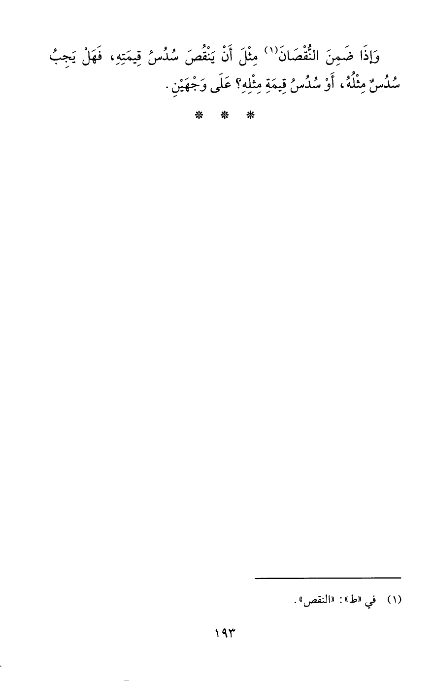 وَإذَا ضَمِنَ النُّقْصَانَ (¬1) مِثْلَ أَنْ يَنْقُصَ سُدُسُ قِيمَتِهِ، فَهَلْ يَجِبُ سُدُسٌ مِثْلُهُ، أَوْ سُدُسُ قِيمَةِ مِثْلِهِ؟ عَلَى وَجْهَيْنِ.