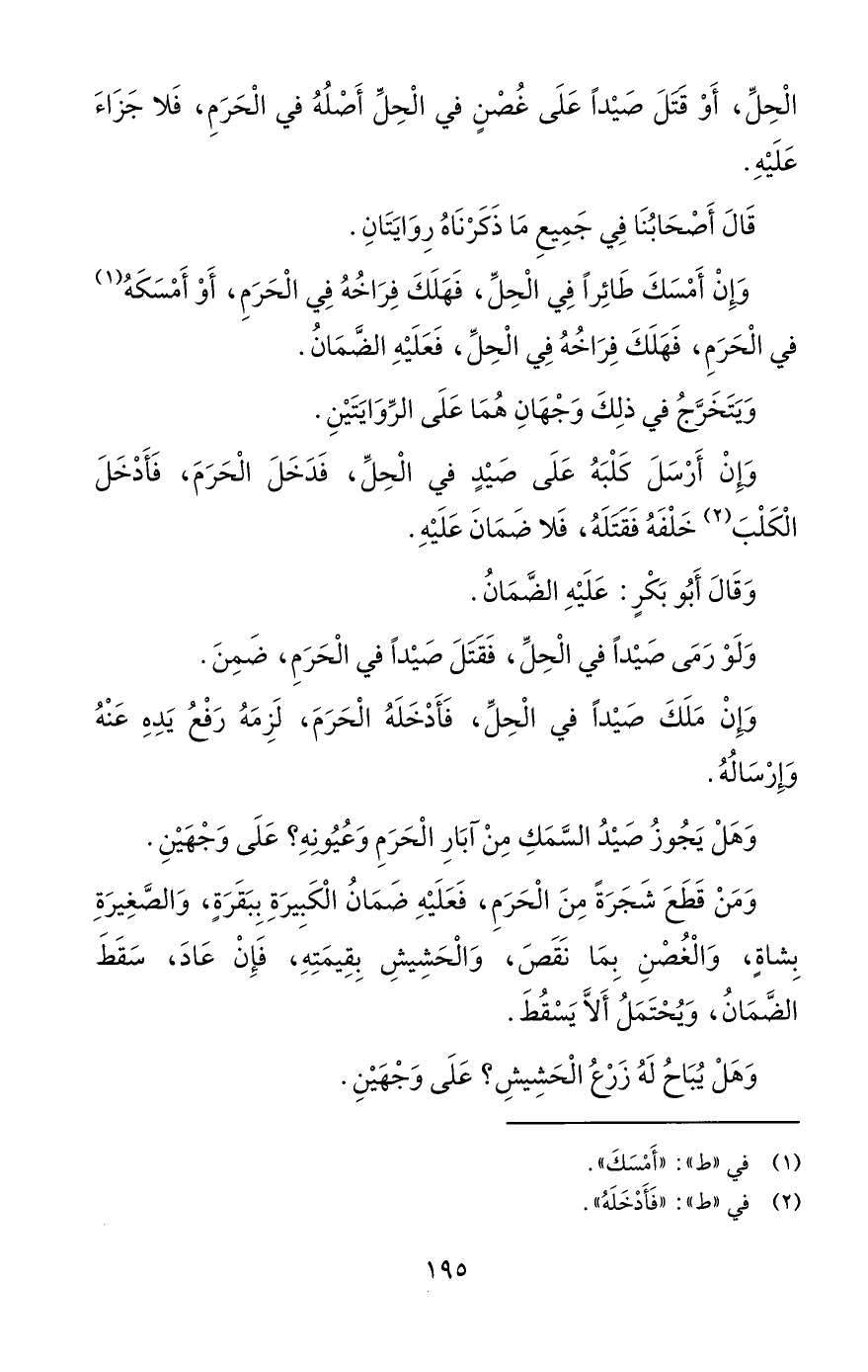 الْحِلِّ، أَوْ قَتَلَ صَيْداً عَلَى غُصْنٍ فِي الْحِلِّ أَصْلُهُ فِي الْحَرَمِ، فَلا جَزَاءَ عَلَيْهِ.