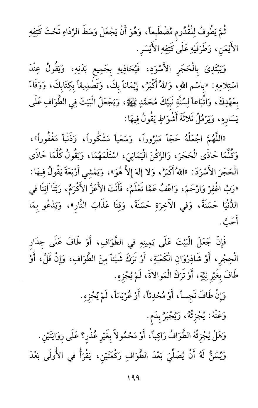 وَيَبْتَدِىَ بِالْحَجَرِ الأَسْوَدِ، فَيُحَاذِيهِ بِجَمِيعِ بَدَنِهِ، وَيَقُولُ عِنْدَ اسْتِلامِهِ: "باسْم اللهِ، وَاللهُ أَكْبَرُ، إِيْمَاناً بِكَ، وَتَصْدِيقاً بِكِتَابِكَ، وَوَفَاءً بِعَهْدِكَ، وَاتِّبَاعاً لِسُنَّةِ نَبِيِّكَ مُحَمَّدٍ - صلى الله عليه وسلم -، وَيَجْعَلُ الْبَيْتَ فِي الطَّوَافِ عَلَى يَسَارِهِ، وَيَرْمُلُ ثَلاثَةَ أَشْوَاطٍ يَقُولُ فِيهَا: