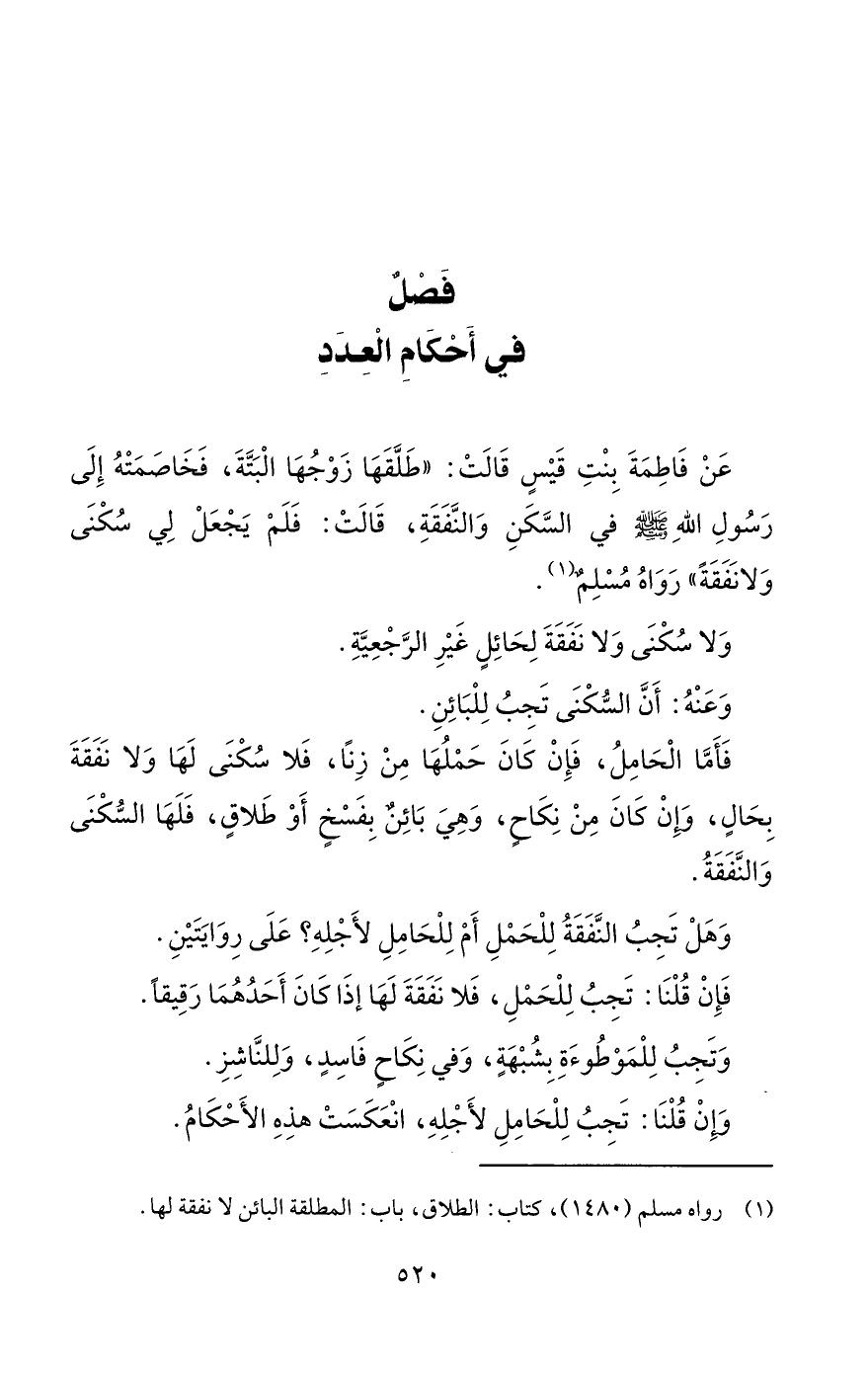 عَنْ فَاطِمَةَ بِنْتِ قَيْسٍ قَالَتْ: "طَلَّقَهَا زَوْجُهَا الْبَتَّةَ، فَخَاصَمَتْهُ إِلَى رَسُولِ اللهِ - صلى الله عليه وسلم - في السَّكَنِ وَالنَّفَقَةِ، قَالَتْ: فَلَمْ يَجْعَلْ لِي سُكْنَى وَلا نَفَقَةً" رَوَاهُ مُسْلِمٌ (¬1).