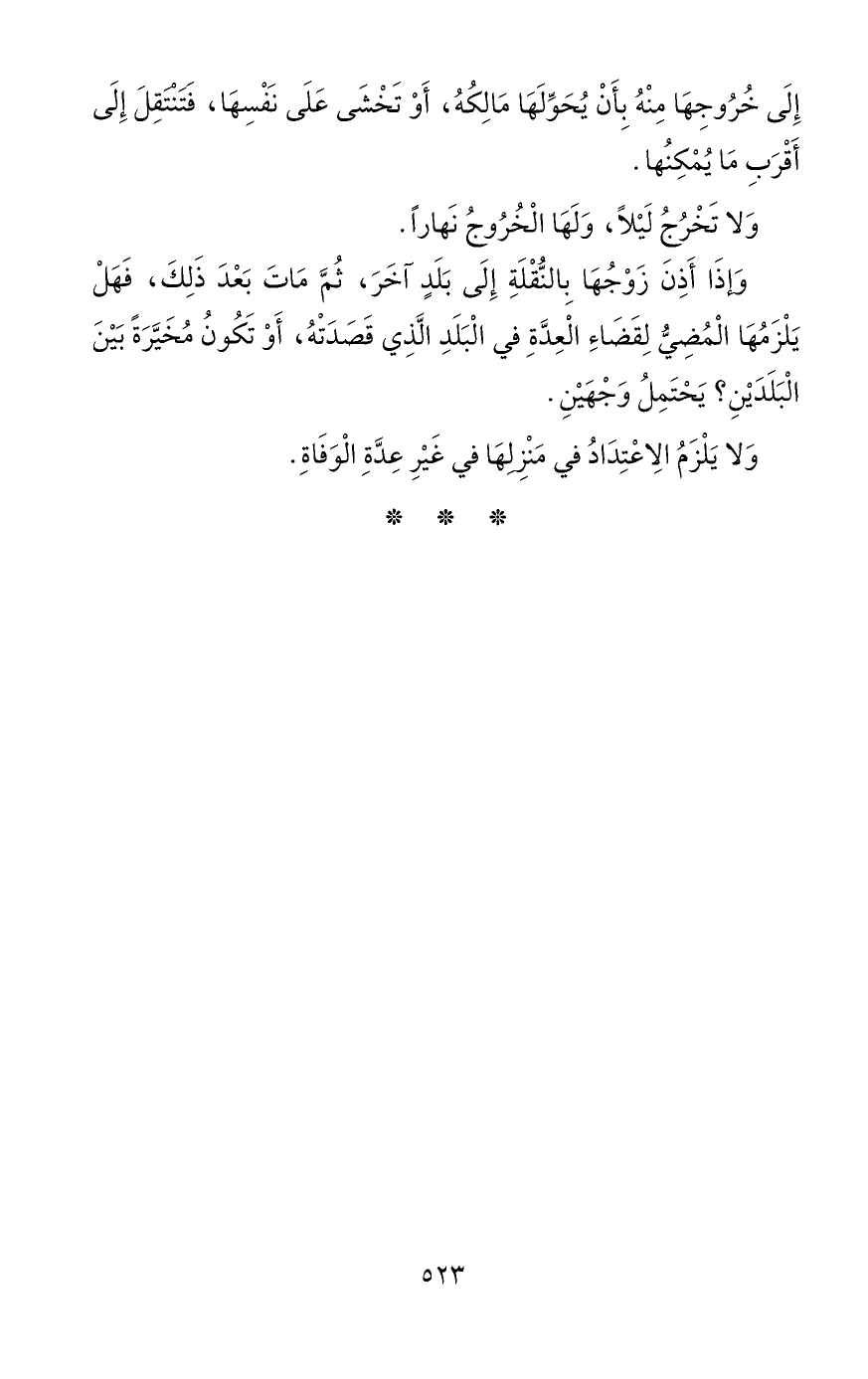 وَإذَا أَذِنَ زَوْجُهَا بِالنُّقْلَةِ إِلَى بَلَدٍ آخَرَ، ثُمَّ مَاتَ بَعْدَ ذَلِكَ، فَهَلْ يَلْزَمُهَا الْمُضِيُّ لِقَضَاءِ الْعِدَّةِ في الْبَلَدِ الَّذِي قَصَدَتْهُ، أَوْ تَكُونُ مُخَيَّرَةً بَيْنَ الْبَلَدَيْنِ؟ يَحْتَمِلُ وَجْهَيْنِ.