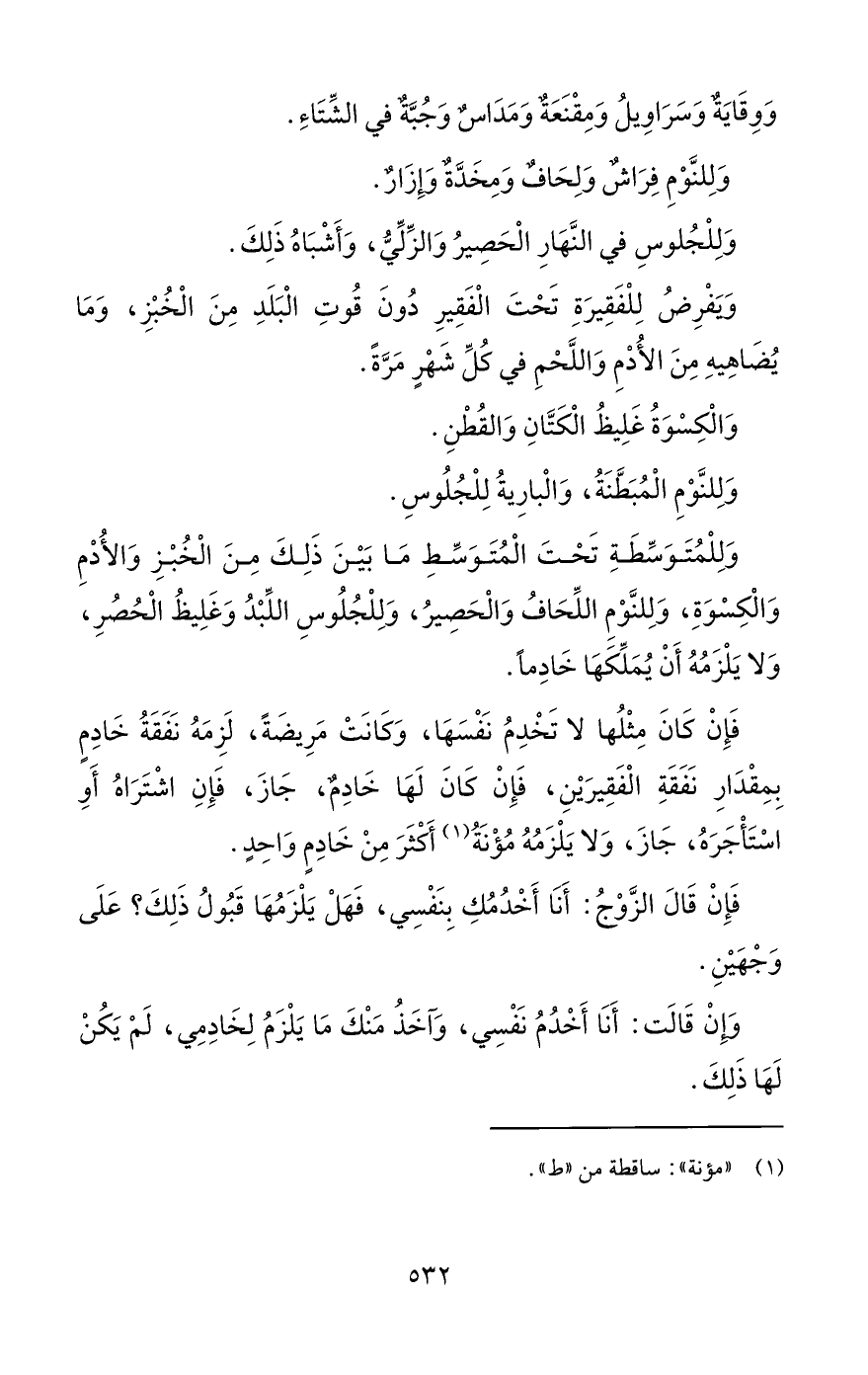 وَلِلْمُتَوَسِّطَةِ تَحْتَ الْمُتَوَسِّطِ مَا بَيْنَ ذَلِكَ مِنَ الْخُبْزِ وَالأُدْمِ وَالْكِسْوَةِ، وَلِلنَّوْمِ اللِّحَافُ وَالْحَصِيرُ، وَلِلْجُلُوسِ اللِّبْدُ وَغَلِيظُ الْحُصُرِ، وَلا يَلْزَمُهُ أَنْ يُمَلِّكَهَا خَادِماً.