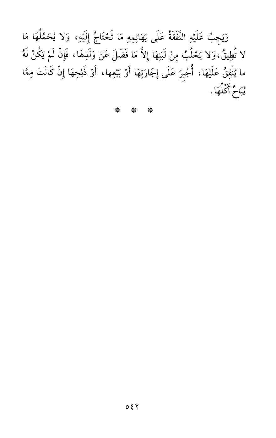 وَيَجِبُ عَلَيْهِ النَّفَقَةُ عَلَى بَهَائِمِهِ مَا تَحْتَاجُ إِلَيْهِ، وَلا يُحَمِّلُهَا مَا لا تُطِيقُ، وَلا يَحْلُبُ مِنْ لَبَنِهَا إِلَّا مَا فَضَلَ عَنْ وَلَدِهَا، فَإِنْ لَمْ يَكُنْ لَهُ ما يُنْفِقُ عَلَيْهَا، أُجْبِرَ عَلَى إِجَارَتهَا أَوْ بَيْعِها، أَوْ ذَبْحِهَا إِنْ كَانَتْ مِمَّا يُبَاحُ أَكْلُهَا.