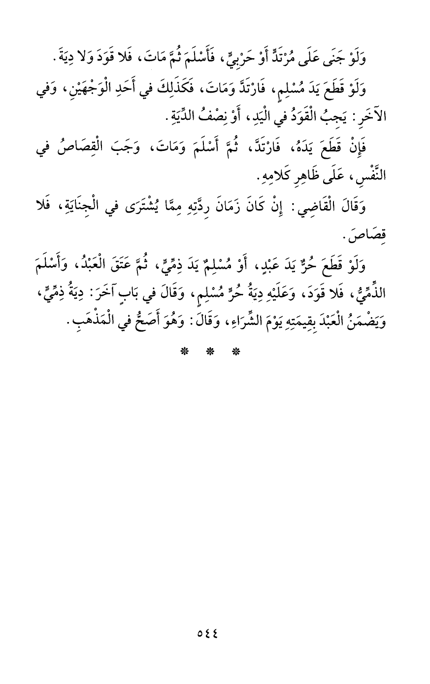 وَلَوْ قَطَعَ حُرٌّ يَدَ عَبْدٍ، أَوْ مُسْلِمٌ يَدَ ذِمِّيٍّ، ثُمَّ عَتَقَ الْعَبْدُ، وَأَسْلَمَ الذِّمِّيُّ، فَلا قَوَدَ، وَعَلَيْهِ دِيَةُ حُرٍّ مُسْلِمٍ، وَقَالَ في بَابٍ آخَرَ: دِيَةُ ذِمِّيٍّ، وَيَضْمَنُ الْعَبْدَ بِقِيمَتِهِ يَوْمَ الشِّرَاءِ، وَقَالَ: وَهُوَ أَصَحُّ في الْمَذْهَبِ.