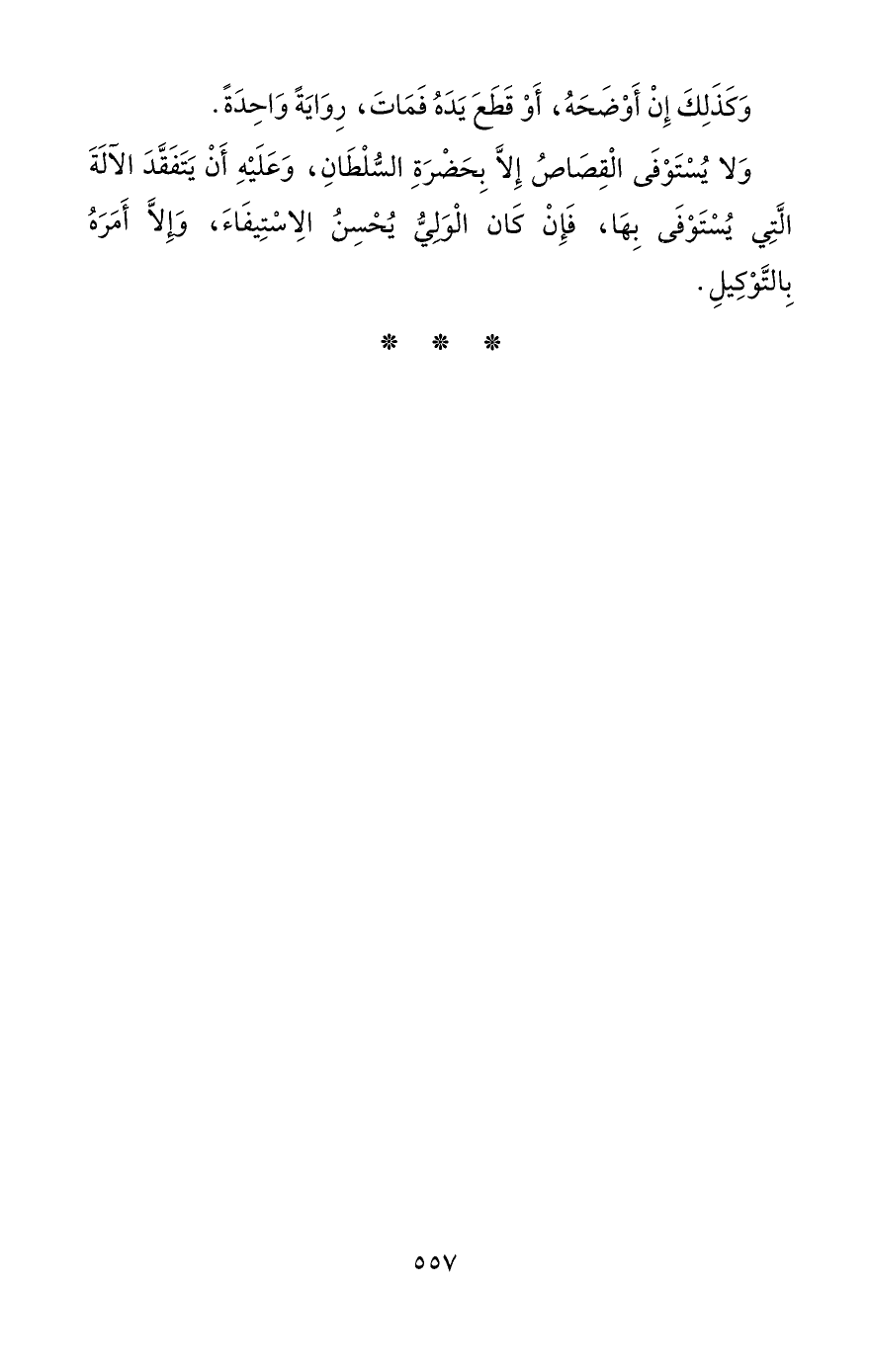 وَلا يُسْتَوْفَى الْقِصَاصُ إِلَّا بِحَضْرَةِ السُّلْطَانِ، وَعَلَيْهِ أَنْ يَتَفَقَّدَ الآلَةَ الَّتِي يُسْتَوْفَى بِهَا، فَإِنْ كَان الْوَليُّ يُحْسِنُ الِاسْتِيفَاءَ، وَإِلَّا أَمَرَهُ بِالتَّوْكِيلِ.