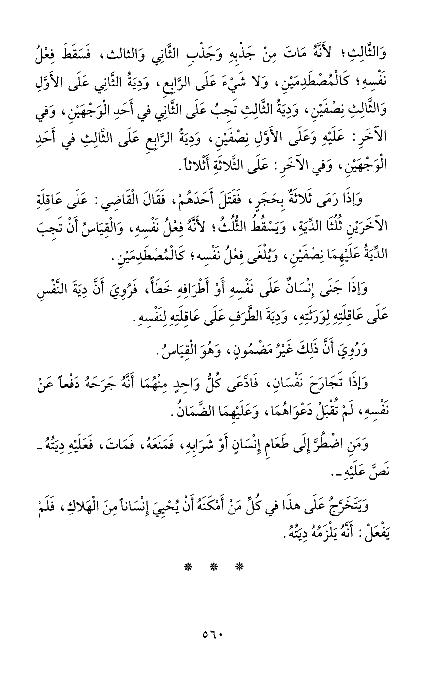 وَالثَّالِثِ؛ لأَنَّهُ مَاتَ مِنْ جَذْبِهِ وَجَذْبِ الثَّانِي وَالثالث، فَسَقَطَ فِعْلُ نَفْسِهِ؛ كَالْمُصْطَدِمَيْنِ، وَلا شَيْءَ عَلَى الرَّابِعِ، وَدِيَةُ الثَّانِي عَلَى الأَوَّلِ وَالثَّالِثِ نِصْفَيْنِ، وَدِيَةُ الثَّالِثِ تَجِبُ عَلَى الثَّانِي في أَحَدِ الْوَجْهَيْنِ، وَفِي الآخَرِ: عَلَيْهِ وَعَلَى الأَوَّلِ نِصْفَيْنِ، وَدِيَةُ الرَّابِعِ عَلَى الثَّالِثِ في أَحَدِ الْوَجْهَيْنِ، وَفِي الآخَرِ: عَلَى الثَّلاثَةِ أَثْلاثاً.