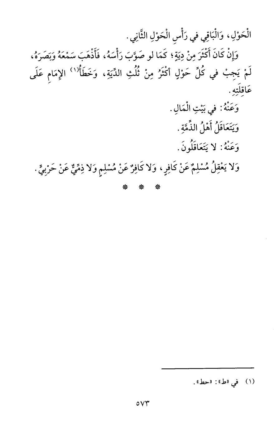 وَلا يَعْقِلُ مُسْلِمٌ عَنْ كَافِرٍ، وَلا كَافِرٌ عَنْ مُسْلِمٍ وَلا ذِمِّيٌّ عَنْ حَرْبِيٍّ.