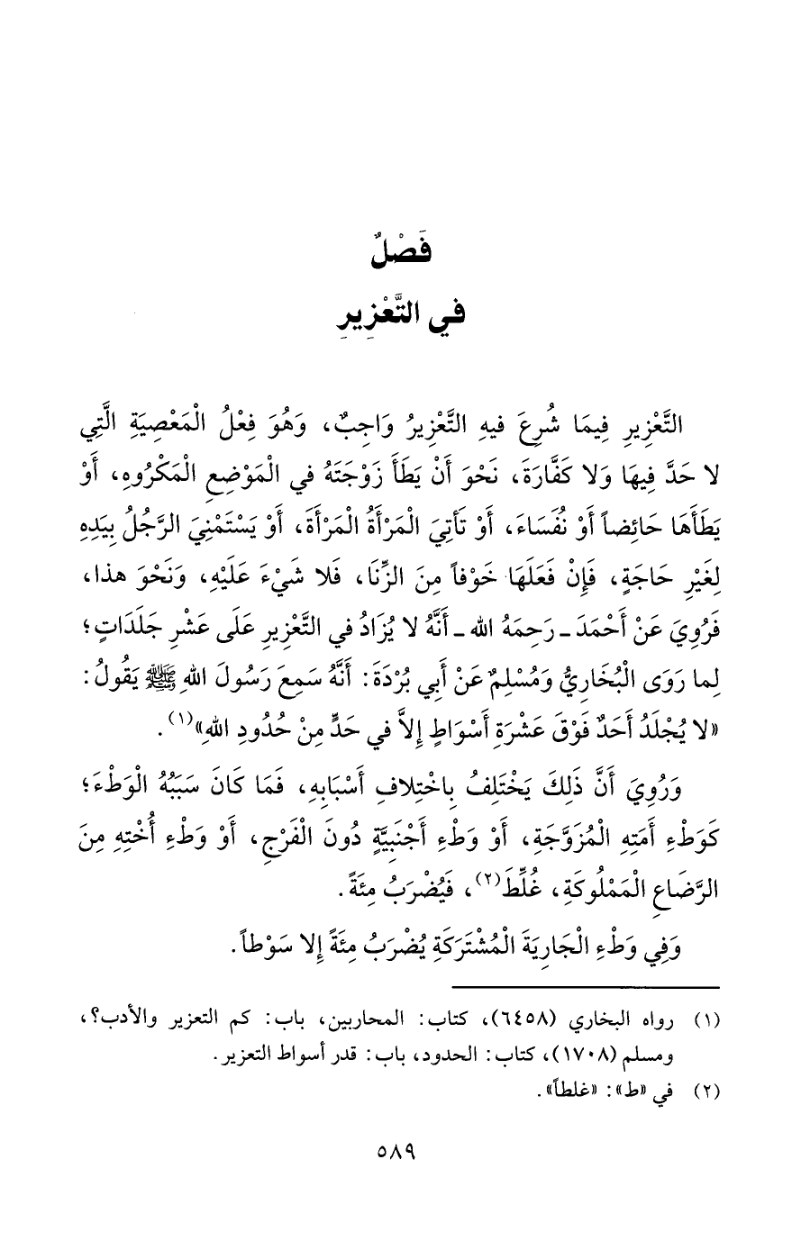 التَّعْزِيرِ فِيمَا شُرِعَ فيهِ التَّعْزِيرُ وَاجِبٌ، وَهُوَ فِعْلُ الْمَعْصِيَةِ الَّتِي لا حَدَّ فِيهَا وَلا كَفَّارَةَ، نَحْوَ أَنْ يَطَأَ زَوْجَتَهُ في الْمَوْضِعِ الْمَكْرُوهِ، أَوْ يَطَأَهَا حَائِضاً أَوْ نُفَسَاءَ، أَوْ تَأتِيَ الْمَرْأَةُ الْمَرْأَةَ، أَوْ يَسْتَمْنِيَ الرَّجُلُ بِيَدِهِ لِغَيْرِ حَاجَةٍ، فَإِنْ فَعَلَهَا خَوْفاً مِنَ الزِّنَا، فَلا شَيْءَ عَلَيْهِ، وَنَحْوَ هذا، فَرُوِيَ عَنْ أَحْمَدَ -رَحِمَهُ الله- أَنَّهُ لا يُزَادُ في التَّعْزِيرِ عَلَى عَشْرِ جَلَدَاتٍ؛ لِما رَوَى الْبُخَارِيُّ وَمُسْلِمٌ عَنْ أَبِي بُرْدَةَ: أَنَّهُ سَمِعَ رَسُولَ اللهِ - صلى الله عليه وسلم - يَقُولُ: "لا يُجْلَدُ أَحَدٌ فَوْقَ عَشْرَةِ أَسْوَاطٍ إِلَّا في حَدٍّ مِنْ حُدُودِ اللهِ" (¬1).