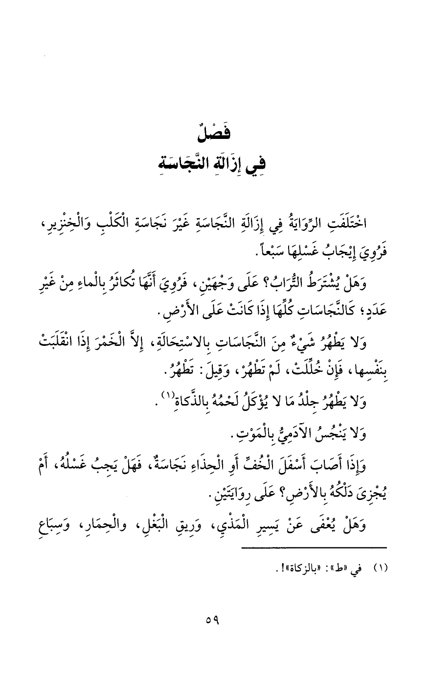 وَإِذَا أَصَابَ أَسْفَلَ الْخُفِّ أَوِ الْحِذَاءِ نَجَاسَةٌ، فَهَلْ يَجِبُ غَسْلُهُ، أَمْ يُجْزِىَ دَلْكُهُ بِالأَرْضِ؟ عَلَى رِوَايَتَيْنِ.