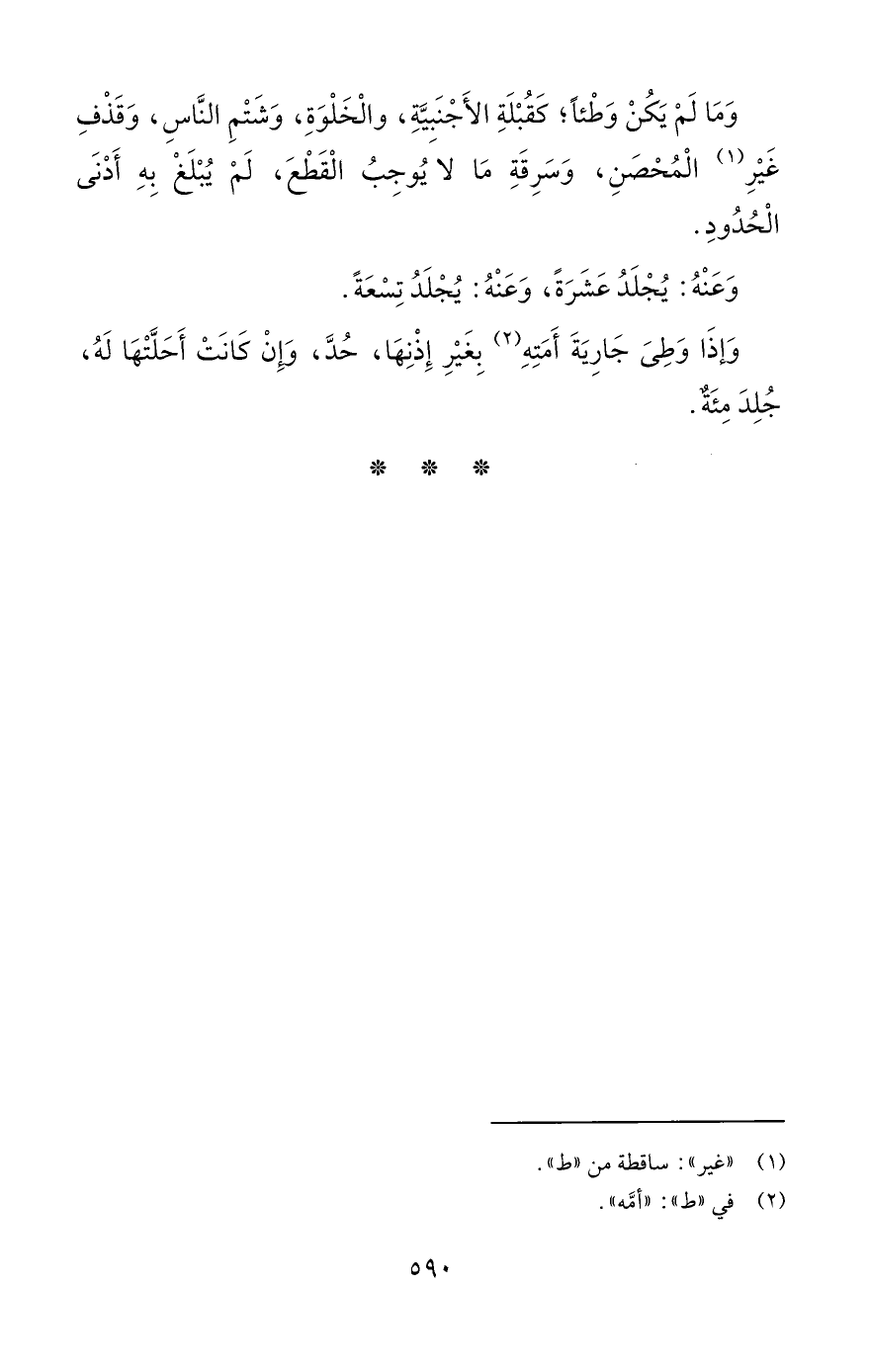 وَمَا لَمْ يَكُنْ وَطْئاً؛ كَقُبْلَةِ الأَجْنَبِيَّةِ، والْخَلْوَةِ، وَشَتْمِ النَّاسِ، وَقَذْفِ غَيْرِ (¬1) الْمُحْصَنِ، وَسَرِقَةِ مَا لاَ يُوجِبُ الْقَطْعَ، لَمْ يُبْلَغْ بِهِ أَدْنَى الْحُدُودِ.