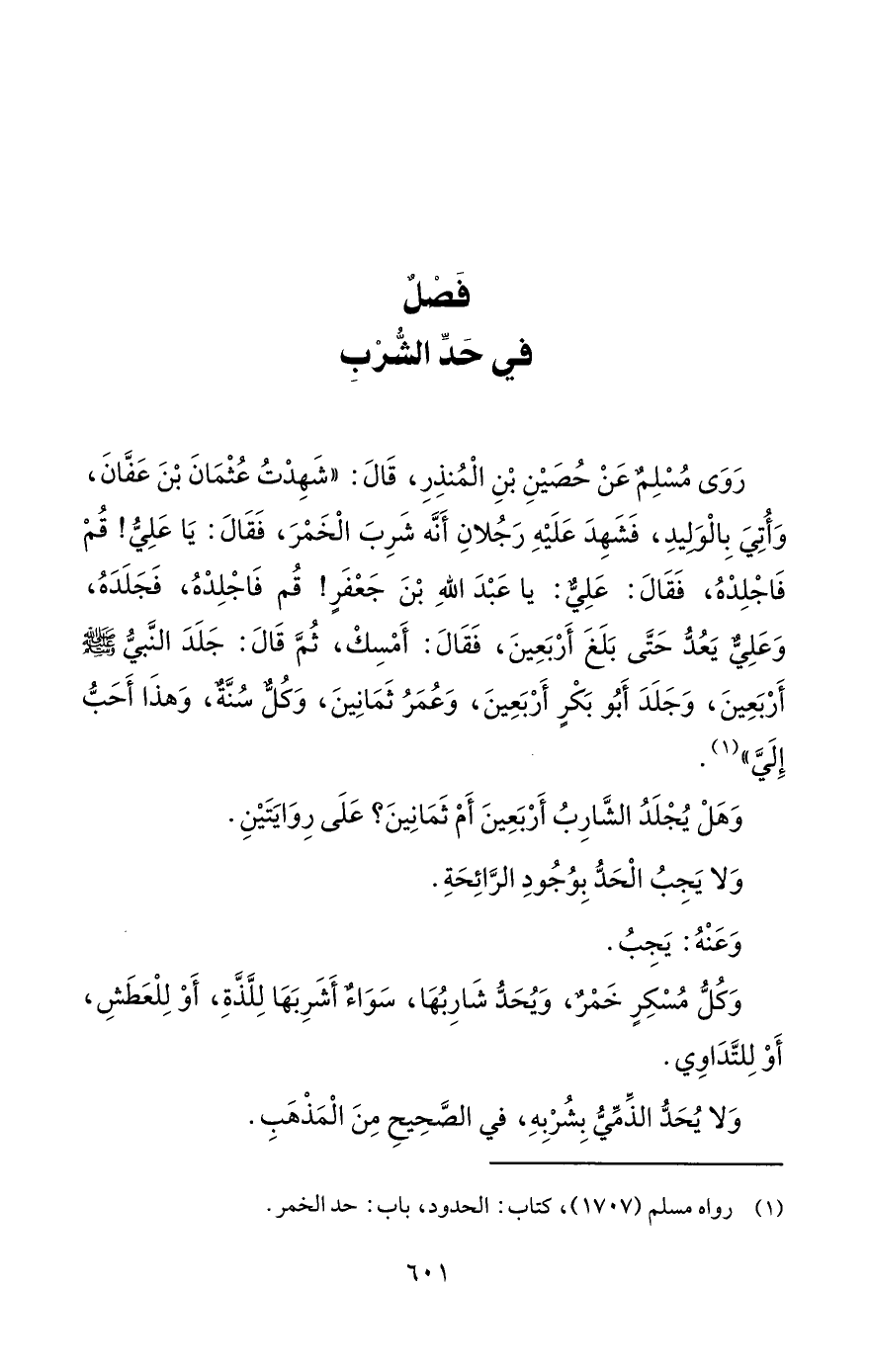 رَوَى مُسْلِمٌ عَنْ حُصَيْنِ بْنِ الْمُنذِرِ، قَالَ: "شَهِدْتُ عُثْمَانَ بْنَ عَفَّانَ، وَأُتِيَ بِالْوَليدِ، فَشَهِدَ عَلَيْهِ رَجُلانِ أَنَّه شَرِبَ الْخَمْرَ، فَقَالَ: يَا عَلِيُّ! قُمْ فَاجْلِدْهُ، فَقَالَ: عَلِيٌّ: يا عَبْدَ اللهِ بْنَ جَعْفَرٍ! قُم فَاجْلِدْهُ، فَجَلَدَهُ، وَعَلِيٌّ يَعُدُّ حَتَّى بَلَغَ أَرْبَعِينَ، فَقَالَ: أَمْسِكْ، ثُمَّ قَالَ: جَلَدَ النَّبيُّ - صلى الله عليه وسلم - أَرْبَعِينَ، وَجَلَدَ أَبُو بَكْرٍ أَرْبَعِينَ، وَعُمَرُ ثَمَانِينَ، وَكُلٌّ سُنَّةٌ، وَهذَا أَحَبُّ إِلَيَّ" (¬1).
