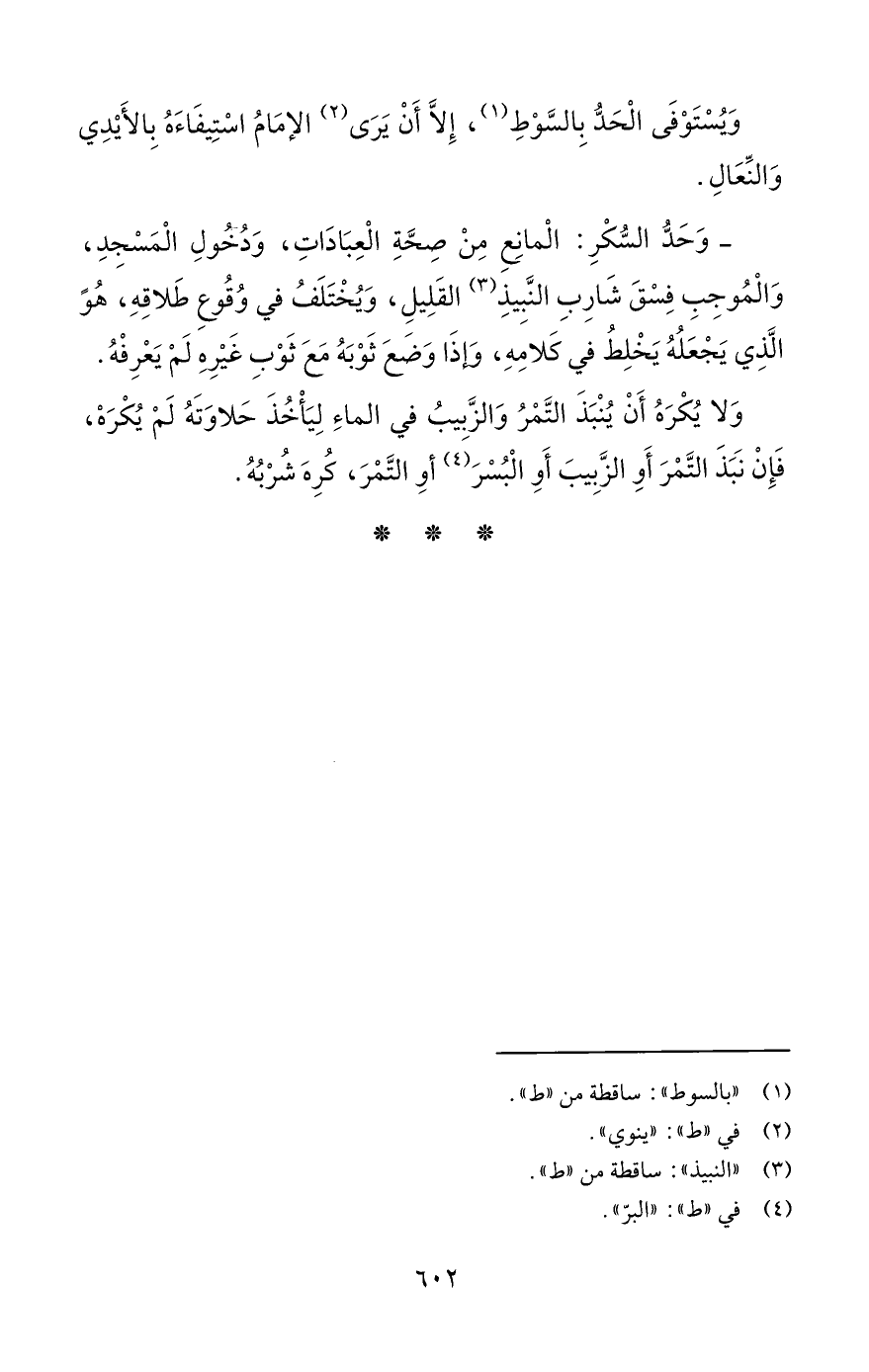 - وَحَدُّ السُّكْرِ: الْمانِعِ مِنْ صِحَّةِ الْعِبَادَاتِ، وَدُخُولِ الْمَسْجِدِ، وَالْمُوجِبِ فِسْقَ شَارِبِ النَّبِيذِ (¬3) القَلِيلِ، وَيُخْتَلَفُ في وُقُوعِ طَلاقِهِ، هُوً الَّذِي يَجْعَلُهُ يَخْلِطُ في كَلامِهِ، وَإذَا وَضَعَ ثَوْبَهُ مَعَ ثَوْبِ غَيْرِهِ لَمْ يَعْرِفْهُ.