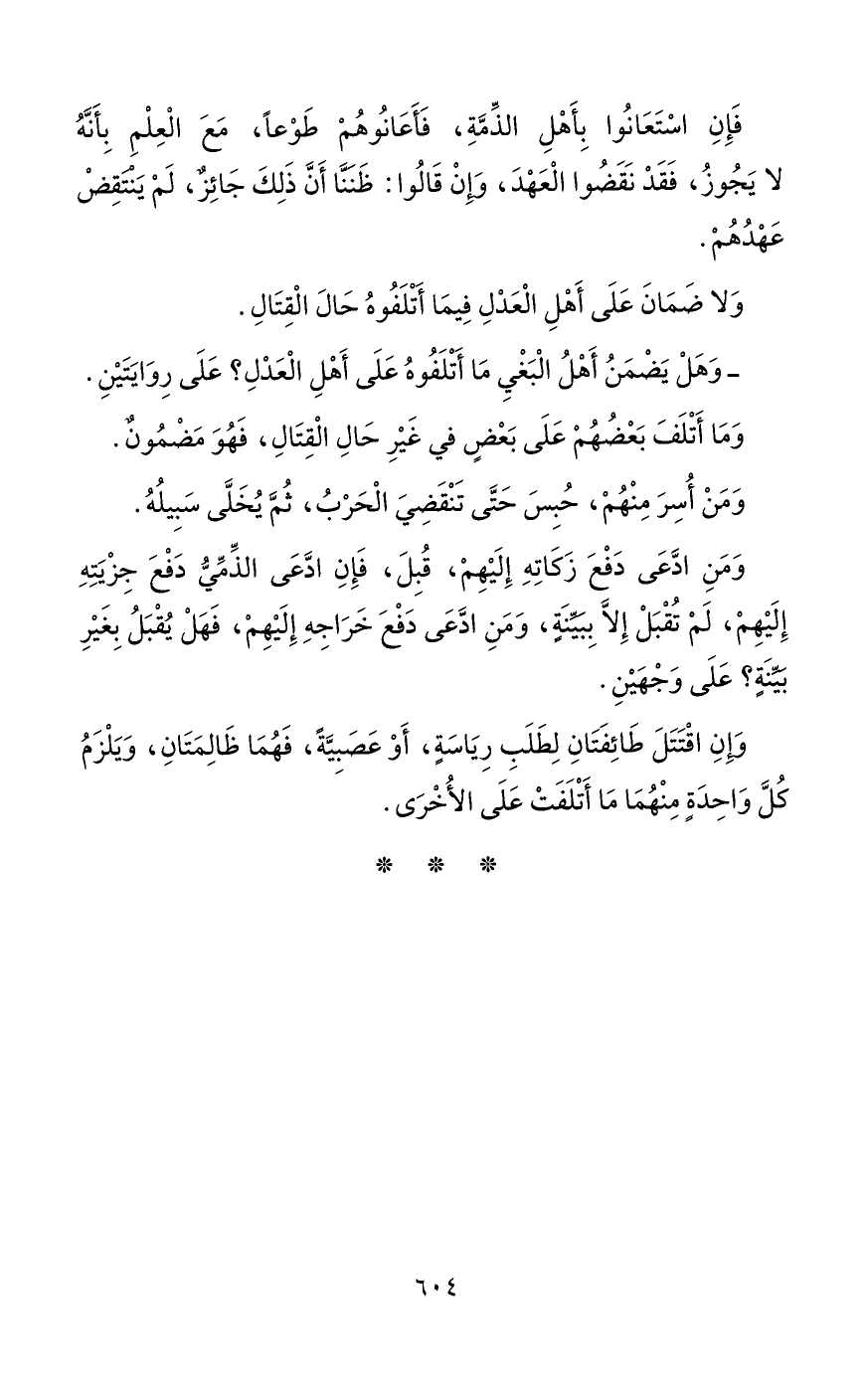 - وَهَلْ يَضْمَنُ أَهْلُ الْبَغْيِ مَا أَتْلَفُوهُ عَلَى أَهْلِ الْعَدْلِ؟ عَلَى رِوَايَتَيْنِ.