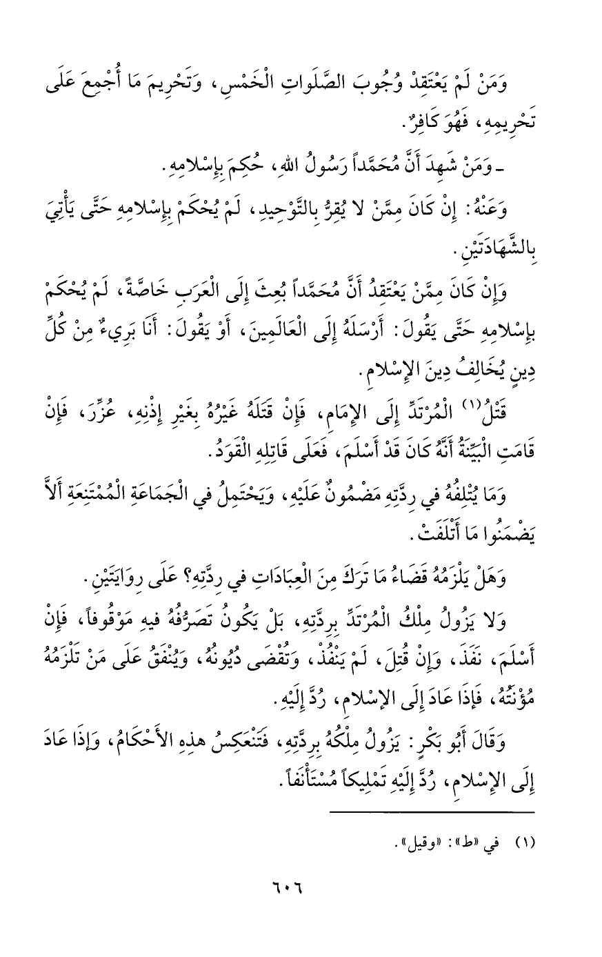 وَمَنْ لَمْ يَعْتَقِدْ وُجُوبَ الصَّلَواتِ الْخَمْسِ، وَتَحْرِيمَ مَا أُجْمِعَ عَلَى تَحْرِيمِهِ، فَهُوَ كَافِرٌ.