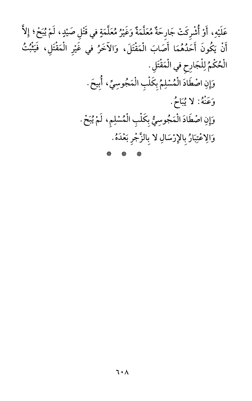 عَلَيْهِ، أَوْ أُشْرِكَتْ جَارِحَةٌ مُعَلَّمَةٌ وَغَيْرُ مُعَلَّمَةٍ في قَتْلِ صَيْدٍ، لَمْ يُبَحْ؛ إِلَّا أَنْ يَكُونَ أَحَدُهُمَا أَصَابَ الْمَقْتَلَ، وَالآخَرُ في غَيْرِ الْمَقْتَلِ، فَيَثْبُتُ الْحُكْمُ لِلْجَارِحِ في الْمَقْتَلِ.