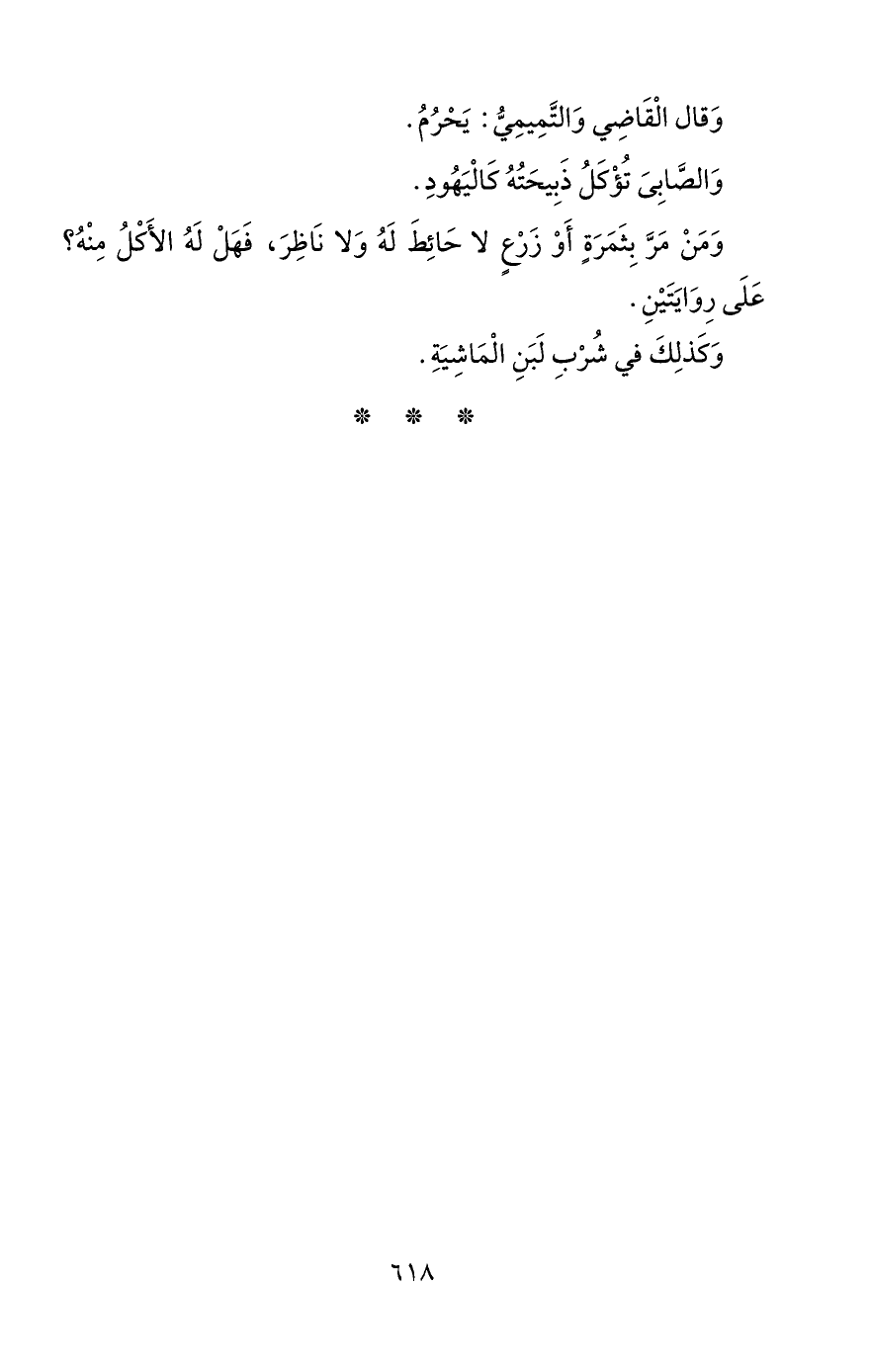 وَمَنْ مَرَّ بِثَمَرَةٍ أَوْ زَرْعٍ لا حَائِطَ لَهُ وَلا نَاظِرَ، فَهَلْ لَهُ الأَكْلُ مِنْهُ؟ عَلَى رِوَايَتَيْنِ.