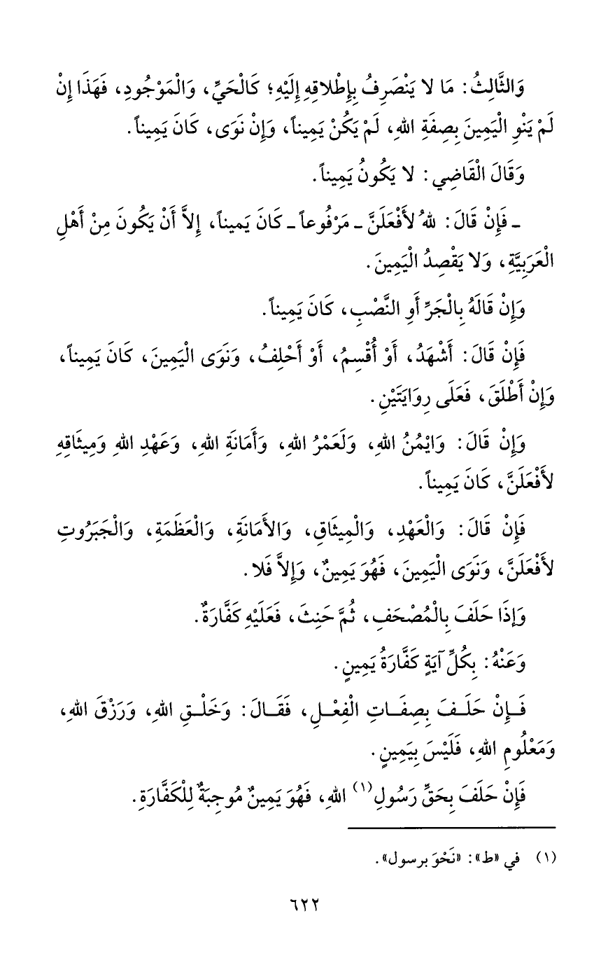 وَالثالِثُ: مَا لا يَنْصَرِفُ بِإِطْلاقِهِ إِلَيْهِ؛ كَالْحَيِّ، وَالْمَوْجُودِ، فَهَذَا إِنْ لَمْ يَنْوِ الْيَمِينَ بِصِفَةِ اللهِ، لَمْ يَكُنْ يَمِينًا، وَإِنْ نَوَى، كَانَ يَمِينًا.
