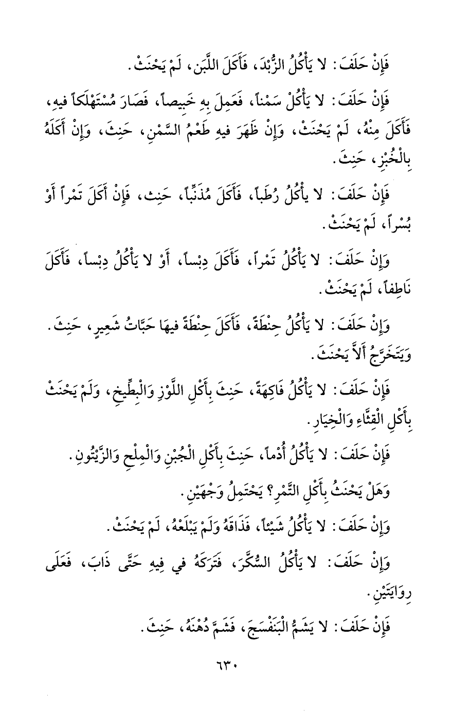 فَإِنْ حَلَفَ: لا يَاْكُلْ سَمْنًا، فَعَمِلَ بِهِ خَبِيصاً، فَصَارَ مُسْتَهْلَكاً فيهِ، فَأَكَلَ مِنْهُ، لَمْ يَحْنَثْ، وَإِنْ ظَهَرَ فيهِ طَعْمُ السَّمْنِ، حَنِثَ، وَإِنْ أَكَلَهُ بِالْخُبْزِ، حَنِثَ.