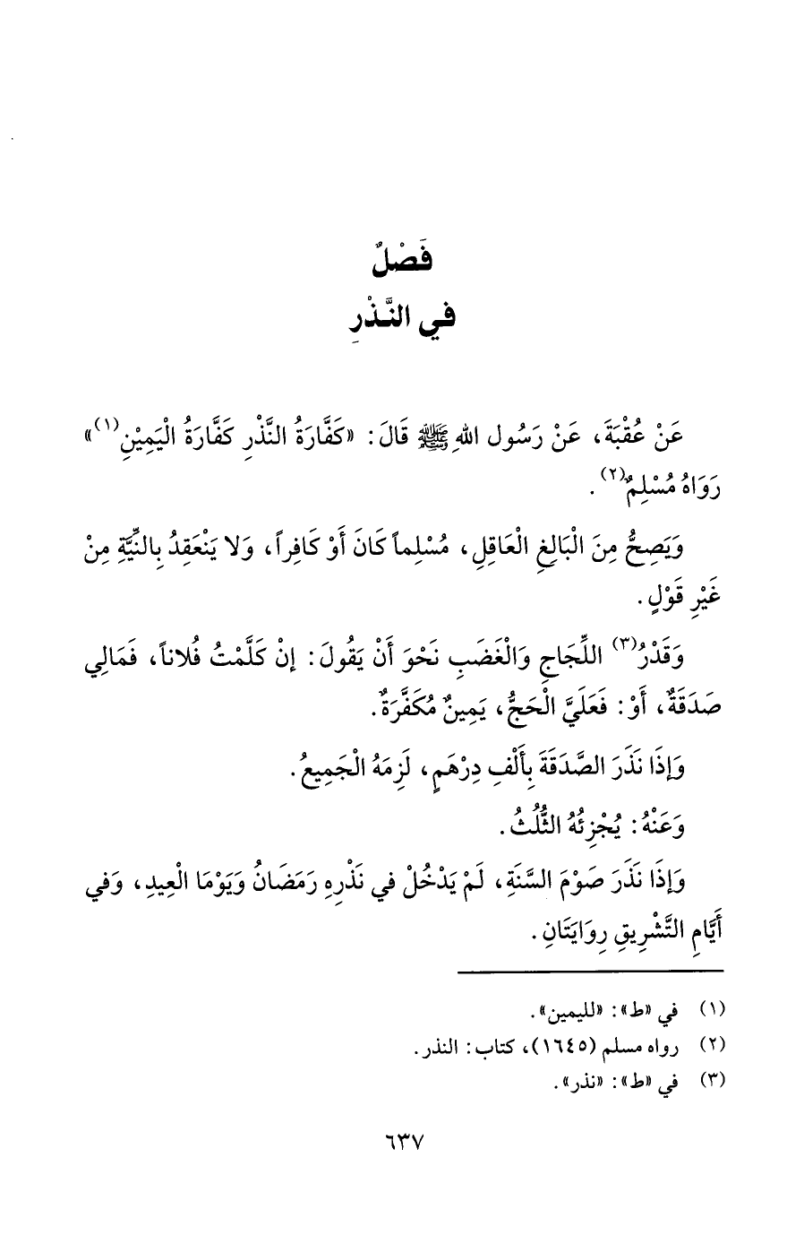 عَنْ عُقْبَةَ، عَنْ رَسُول اللهِ - صلى الله عليه وسلم - قَالَ: "كَفَّارَةُ النَّذْرِ كَفَّارَةُ الْيَمِيْنِ (¬1) " رَوَاهُ مُسْلِمٌ (¬2).