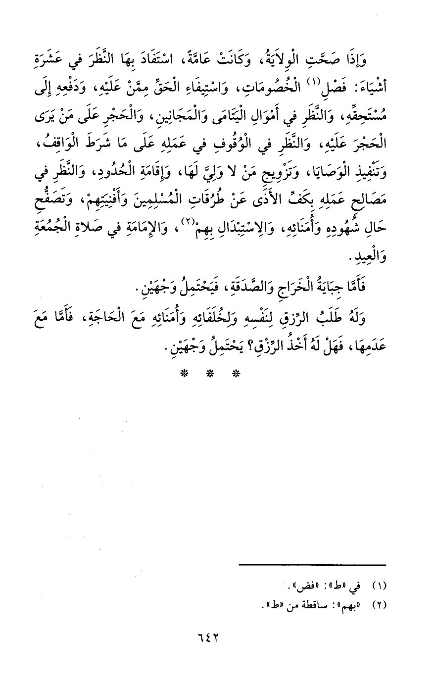 وَإذَا صَحَّتِ الْوِلاَيَةُ، وَكَانَتْ عَامَّةً، اسْتَفَادَ بِهَا النَّظَرَ في عَشَرَةِ أشْيَاءَ: فَصْلِ (¬1) الْخُصُومَاتِ، وَاسْتيفَاءِ الْحَقِّ مِمَّنْ عَلَيْهِ، وَدَفْعِهِ إِلَى مُسْتَحِقِّهِ، وَالنَّظَرِ في أَمْوَالِ الْيَتَامَى وَالْمَجَانِينِ، وَالْحَجْرِ عَلَى مَنْ يَرَى الْحَجْرَ عَلَيْهِ، وَالنَّظَرِ في الْوُقُوفِ في عَمَلِهِ عَلَى مَا شَرَطَ الْوَاقِفُ، وَتَنْفِيذِ الْوَصَايَا، وَتَزْوِيجِ مَنْ لا وَلِيَّ لَهَا، وَإِقَامَةِ الْحُدُودِ، وَالنَّظَرِ في مَصَالِح عَمَلِهِ بِكَفِّ الأَذَى عَنْ طُرُقَاتِ الْمُسْلِمِينَ وَأَفْنِيَتِهِمْ، وَتَصَفُّحِ حَالِ شُهُودِهِ وَأُمَنَائِهِ، وَالِاسْتِبْدَالِ بِهِمْ (¬2)، وَالإِمَامَةِ في صَلاةِ الْجُمُعَةِ وَالْعِيدِ.