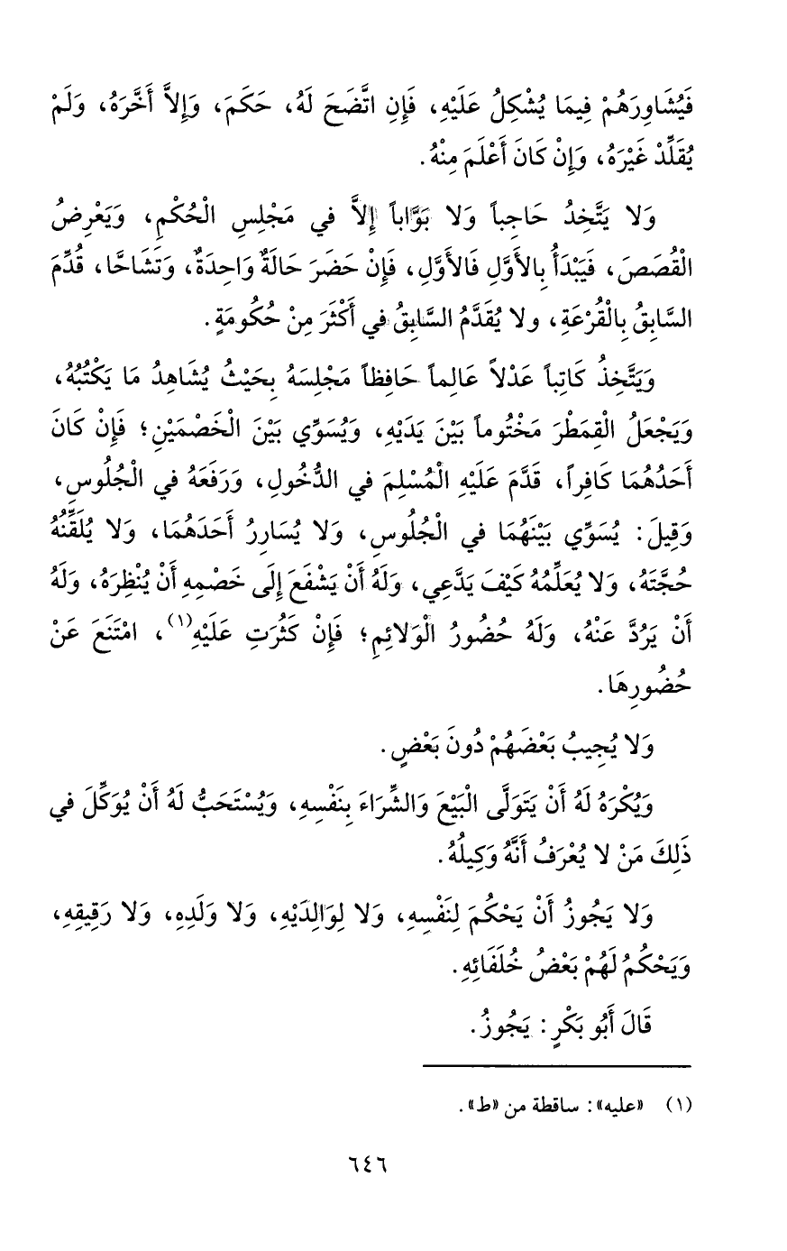 وَيَتَّخِذُ كَاتِبا عَدْلاً عَالِمًا حَافِظًا مَجْلِسَهُ بِحَيْثُ يُشَاهِدُ مَا يَكْتُبُهُ، وَيَجْعَلُ الْقِمَطْرَ مَخْتُومًا بَيْنَ يَدَيْهِ، وَيُسَوِّي بَيْنَ الْخَصْمَيْنِ؛ فَإِنْ كَانَ أَحَدُهُمَا كَافِراً، قَدَّمَ عَلَيْهِ الْمُسْلمَ في الدُّخُولِ، وَرَفَعَهُ في الْجُلُوس، وَقِيلَ: يُسَوِّي بَيْنَهُمَا في الْجُلُوسِ، وَلا يُسَارِرُ أَحَدَهُمَا، وَلا يُلَقِّنُهُ حُجَّتَهُ، وَلا يُعَلِّمُهُ كَيْفَ يَدَّعِيِ، وَلَهُ أَنْ يَشْفَعَ إِلَى خَصْمِهِ أَنْ يُنْظِرَهُ، وَلَهُ أَنْ يَرُدَّ عَنْهُ، وَلَهُ حُضُورُ الْوَلائِمِ؛ فَإِنْ كَثُرَتِ عَلَيْهِ (¬1)، امْتَنَعَ عَنْ