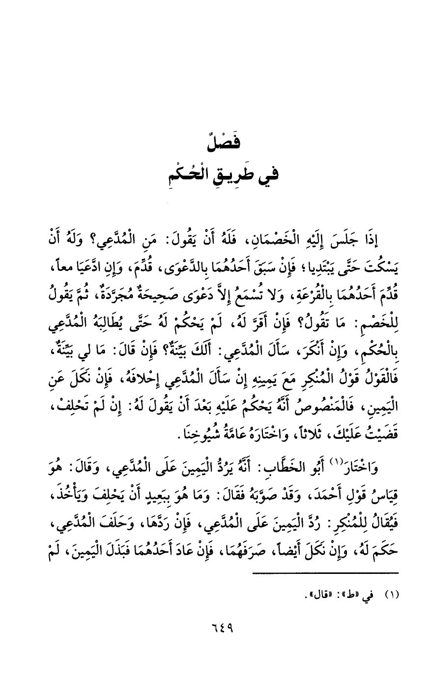 إذَا جَلَسَ إِلَيْهِ الْخَصْمَانِ، فَلَهُ أَنْ يَقُولَ: مَنِ الْمُدَّعِي؟ وَلَهُ أَنْ يَسْكُتَ حَتَّى يَبْتَدِيا؛ فَإِنْ سَبق أَحَدُهُمَا بِالدَّعْوَى، قُدِّمَ، وَإِنِ ادَّعَيَا معاً، قُدِّمَ أَحَدُهُمَا بِالْقُرْعَةِ، وَلا تُسْمَعُ إِلَّا دَعْوَى صَحِيحَةٌ مُجَرَّدَةٌ، ثُمَّ يَقُولُ لِلْخَصْمِ: مَا تَقُولُ؟ فَإِنْ أقرَّ لَهُ، لَمْ يَحْكُمْ لَهُ حَتَى يُطَالِبَهُ الْمُدَّعِي بِالْحُكْمِ، وَإِنْ أَنْكَرَ، سَأَلَ الْمُدَّعِي: ألكَ بَيِّنَةٌ؟ فَإنْ قَالَ: مَا لي بيِّنَةٌ، فَالْقَوْلُ قَوْلُ الْمُنْكِرِ مَعَ يَميِنِهِ إِنْ سَأَلَ الْمُدَّعِي إِحْلافَهُ، فَإِنْ نَكَلَ عَنِ الْيَمِينِ، فَالْمَنْصُوصُ أَنَّهُ يَحْكُمُ عَلَيْهِ بَعْدَ أَنْ يَقُولَ لَهُ: إِنْ لَمْ تَحْلِفْ، قَضَيْتُ عَلَيْكَ، ثَلاثاً، وَاخْتَارَهُ عَامَّةُ شُيُوخِنَا.