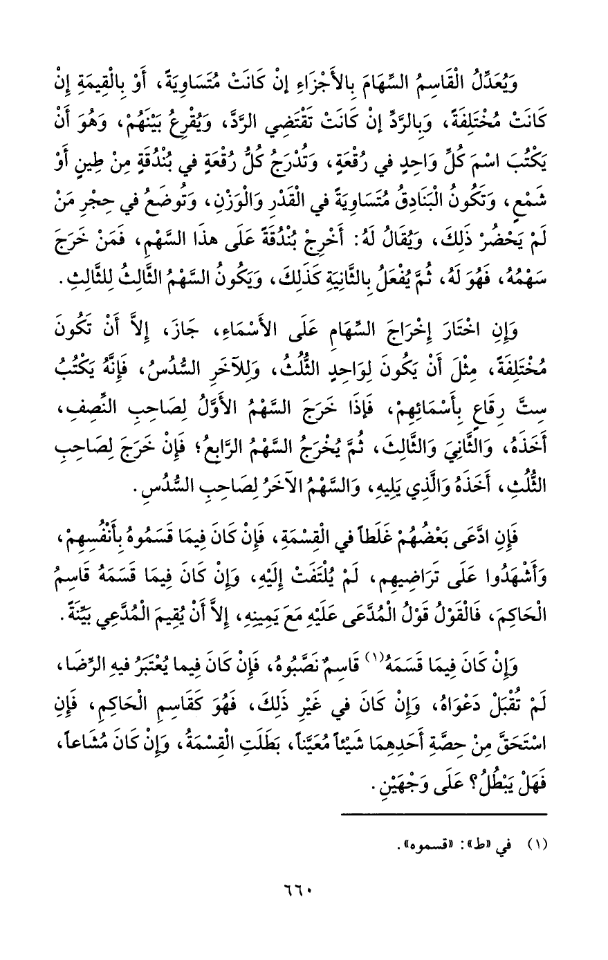 وُيعَدِّلُ الْقَاسِمُ السِّهَامَ بِالأَجْزَاءِ إنْ كَانَتْ مُتَسَاوِيَةً، أَوْ بِالْقِيمَةِ إِنْ كَانَتْ مُخْتَلِفَةً، وَبِالرَّدِّ إنْ كَانَتْ تَقْتَضِي الرَّدَّ، وَيُقْرِعُ بَيْنَهُمْ، وَهُوَ أَنْ يَكْتُبَ اسْمَ كُلِّ وَاحِدٍ في رُقْعَةٍ، وَتُدْرَجُ كُل رُقْعَةٍ في بُنْدُقَةٍ مِنْ طِينٍ أَوْ شَمْعٍ، وَتَكُونُ الْبَنَادِقُ مُتَسَاوِيَةً في الْقَدْرِ وَالْوَزْنِ، وَتُوضَعُ في حِجْرِ مَنْ لَمْ يَحْضُرْ ذَلِكَ، وُيقَالُ لَهُ: أَخْرِجْ بُنْدُقَةً عَلَى هذَا السَّهْمِ، فَمَنْ خَرَجَ سَهْمُهُ، فَهُوَ لَهُ، ثُمَّ يُفْعَلُ بِالثَّانِيَةِ كَذَلِكَ، وَيَكُونُ السَّهْمُ الثالِثُ لِلثَّالِثِ.