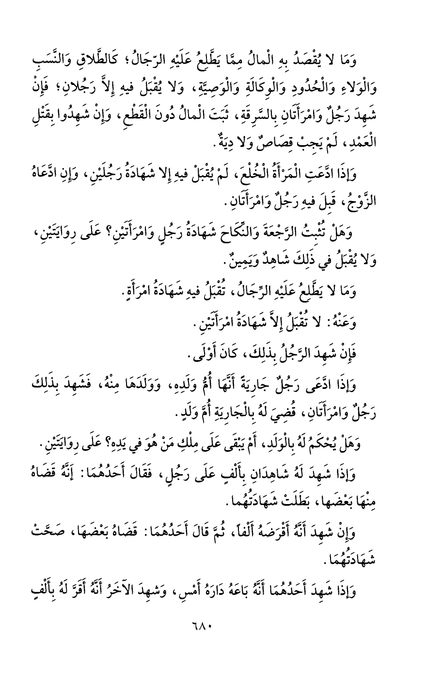 وَمَا لا يُقْصَدُ بِهِ الْمالُ مِمَّا يَطَّلِعُ عَلَيْهِ الرّجَالُ؛ كَالطَّلاقِ وَالنَّسَبِ وَالْوَلاءِ وَالْحُدُودِ وَالْوِكَالَةِ وَالْوَصِيَّةِ، وَلا يُقْبَلُ فيهِ إِلَّا رَجُلانِ؛ فَإِنْ شَهِدَ رَجُلٌ وَامْرَأَتَانِ بِالسَّرِقَةِ، ثَبَتَ الْمالُ دُونَ الْقَطْعِ، وَإِنْ شَهِدُوا بِقَتْلِ الْعَمْدِ، لَمْ يَجِبْ قِصَاصٌ وَلا دِيَةٌ.