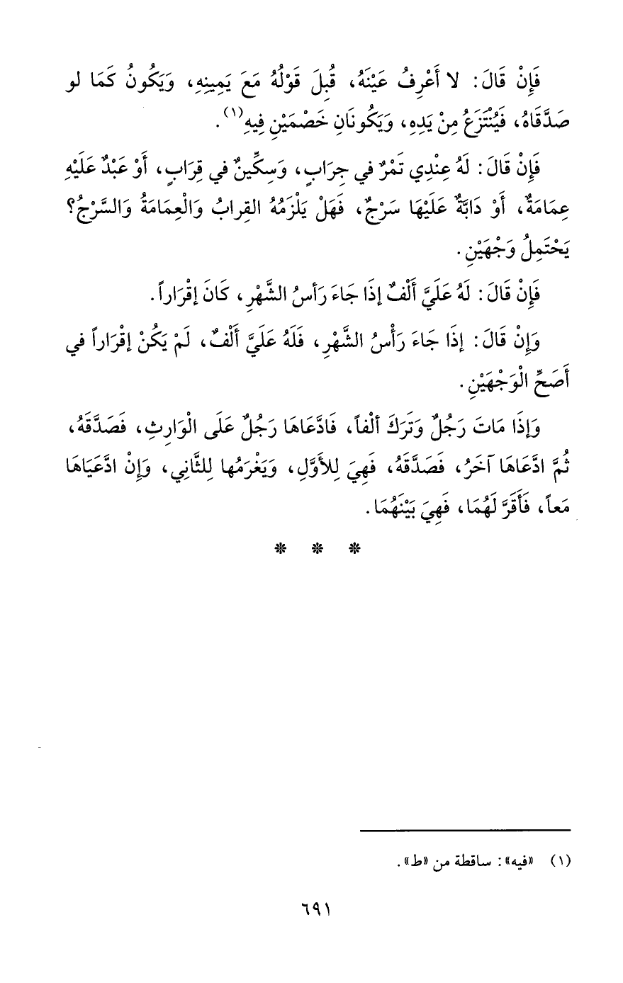 وَإذَا مَاتَ رَجُلٌ وَتَرَكَ ألْفاً، فَادَّعَاهَا رَجُلٌ عَلَى الْوَارِثِ، فَصَدَّقَهُ، ثُمَّ ادَّعَاهَا آخَرُ، فَصَدَّقَهُ، فَهِيَ لِلأَوَّلِ، وَيَغْرَمُها لِلثَّانِي، وَإِنْ ادَّعَيَاهَا مَعاً، فَأَقَرَّ لَهُمَا، فَهِيَ بَيْنَهُمَا.