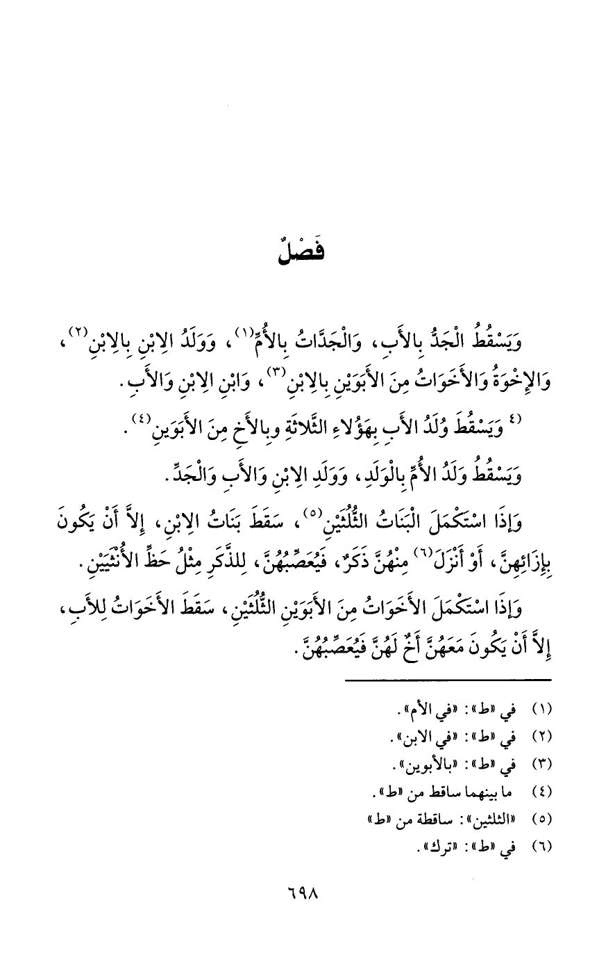 وَيَسْقُطُ الْجَدُّ بِالأَبِ، وَالْجَدَّاتُ بالأُمِّ (¬1)، وَوَلَدُ الِابْنِ بِالِابْنِ (¬2)، وَالإِخْوَةُ وَالأَخَوَاتُ مِنَ الأَبَوَيْنِ بِالِابْنِ (¬3)، وَابْنِ الِابْنِ وَالأَبِ.