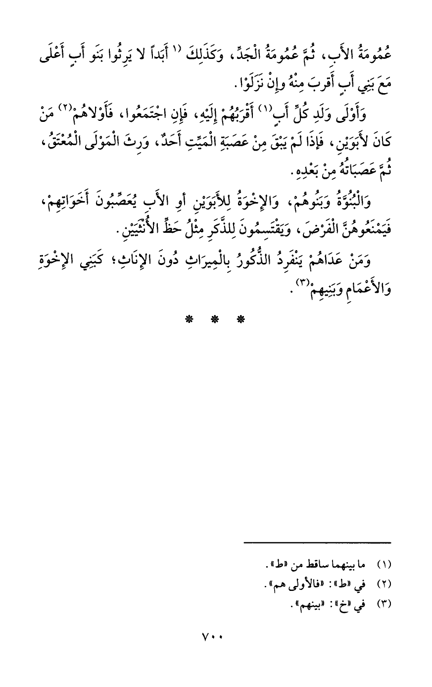 وَمَنْ عَدَاهُمْ يَنْفَرِدُ الذُّكُورُ بِالْمِيرَاثِ دُونَ الإِنَاثِ؛ كَبَنِي الإِخْوَةِ وَالأَعْمَامِ وَبَنِيهِمْ (¬3).