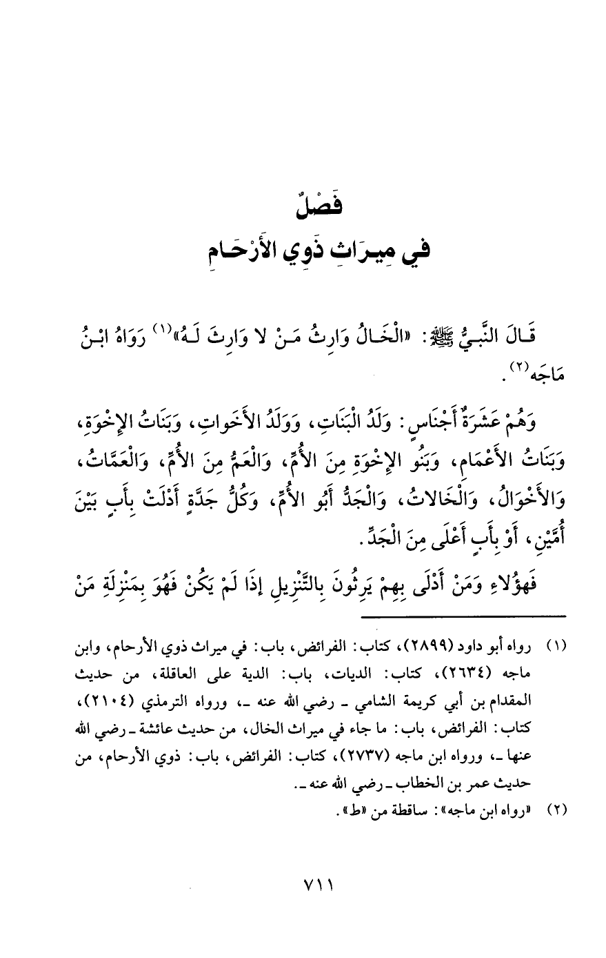 (¬1) رواه أبو داود (2899)، كتاب: الفرائض، باب: في ميراث ذوي الأرحام، وابن ماجه (2634)، كتاب: الديات، باب: الدية على العاقلة، من حديث المقدام بن أبي كريمة الشامي -رضي الله عنه-، ورواه الترمذي (2104)، كتاب: الفرائض، باب: ما جاء في ميراث الخال، من حديث عائشة -رضي الله عنها-، ورواه ابن ماجه (2737)، كتاب: الفرائض، باب: ذوي الأرحام، من حديث عمر بن الخطاب -رضي الله عنه-.