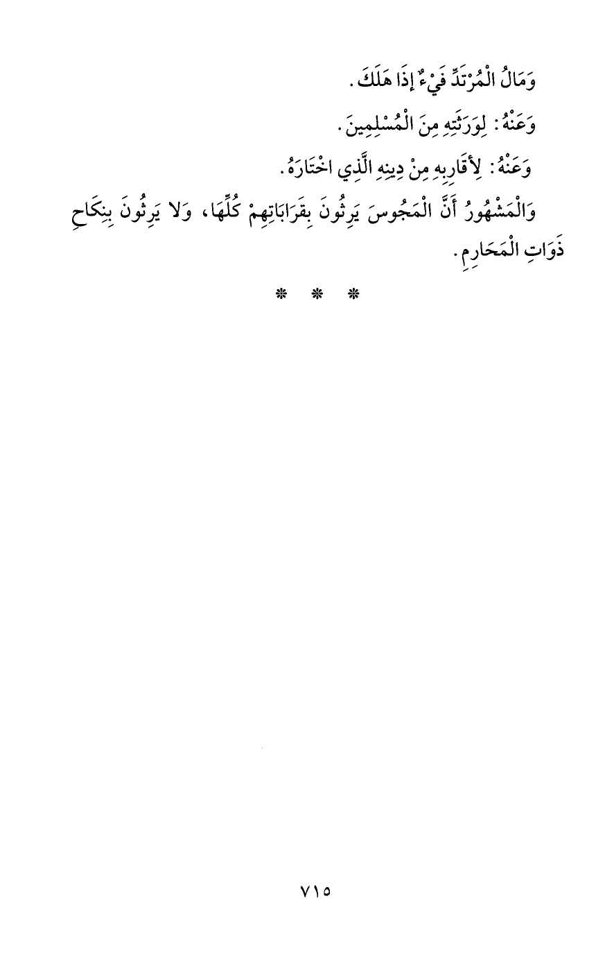 وَالْمَشْهُورُ أَنَّ الْمَجُوسَ يَرِثُونَ بِقَرَابَاتِهِمْ كُلِّهَا، وَلا يَرِثُونَ بِنِكَاحِ ذَوَاتِ الْمَحَارِمِ.