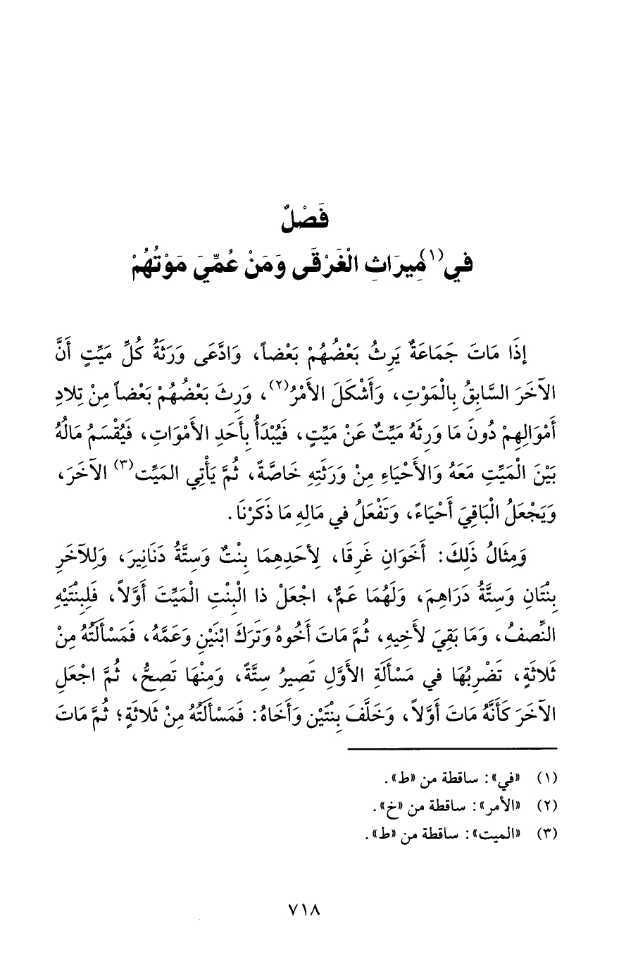 وَمِثَالُ ذَلِكَ: أَخَوَانِ غَرِقَا، لِأحَدِهِمَا بِنْتٌ وَسِتَّةُ دَنَانِيرَ، وَلِلآخَرِ بِنْتَانِ وَسِتَّةُ دَرَاهِمَ، وَلَهُمَا عَمٌّ، اجْعَلْ ذا الْبِنْتِ الْمَيِّتَ أَوَّلًا، فَلِبِنْتَيْهِ النِّصفُ، وَمَا بَقِيَ لأَخِيهِ، ثُمَّ مَاتَ أَخُوهُ وَتَرَكَ ابْنَيْنِ وَعَمَّهُ، فَمَسْأَلَتُهُ مِنْ ثَلاثَةٍ، تَضْرِبُهَا في مَسْأَلةِ الأَوَّلِ تَصِيرُ سِتَّةً، وَمِنْهَا تَصِحُّ، ثُمَّ اجْعَلِ الآخَرَ كَأَنَّهُ مَاتَ أَوَّلًا، وَخَلَّفَ بِنْتَيْن وَأَخَاهُ: فَمَسْأَلَتُهُ مِنْ ثَلاثَةٍ؛ ثُمَّ مَاتَ
