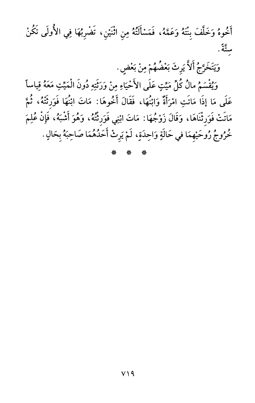 وَيُقْسَمُ مالُ كُلِّ مَيِّتٍ عَلَى الأَحْيَاءِ مِنْ وَرَثَتِهِ دُونَ الْمَيِّتِ مَعَهُ قِياسًا عَلَى مَا إذَا مَاتَتِ امْرَأَةٌ وَابْنُهَا، فَقَالَ أَخُوهَا: مَاتَ ابْنُهَا فَوَرِثَتْهُ، ثُمَّ مَاتَتْ فَوَرِثْنَاهَا، وَقَالَ زَوْجُهَا: مَاتَ ابْنِي فَوَرِثْتُهُ، وَهُوَ أَشْبَهُ، فَإِنْ عُلِمَ خُرُوجُ رُوحَيْهِمَا في حَالَةٍ وَاحِدَةٍ، لَمْ يَرِثْ أَحَدُهُمَا صَاحِبَهُ بِحَالٍ.