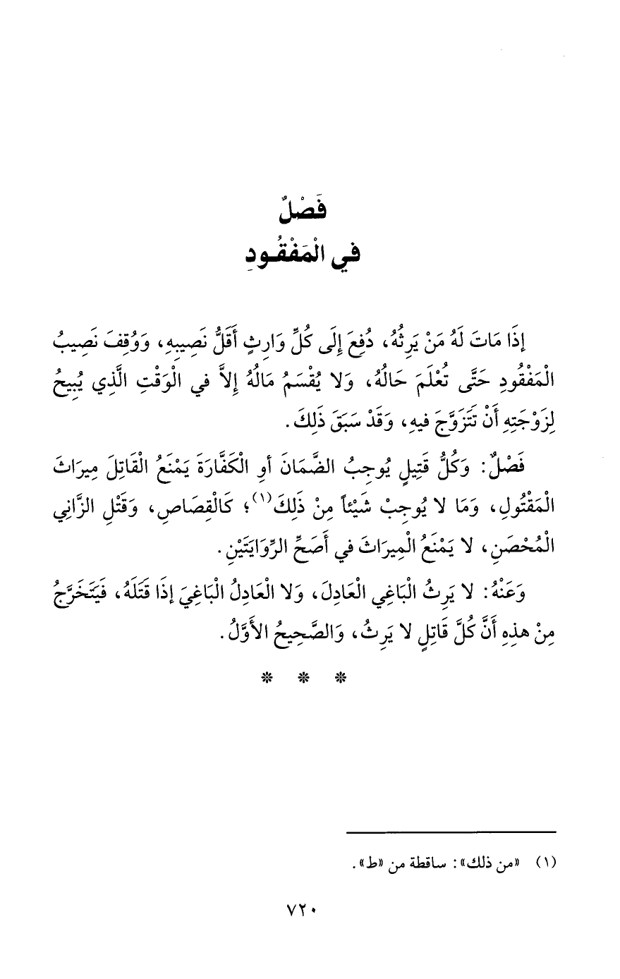 إذَا مَاتَ لَهُ مَنْ يَرِثُهُ، دُفِعَ إِلَى كُلِّ وَارِثٍ أَقَلُّ نَصِيبِهِ، وَوُقِفَ نَصِيبُ الْمَفْقُودِ حَتَّى تُعْلَمَ حَالُهُ، وَلا يُقْسَمُ مَالُهُ إِلَّا في الْوَقْتِ الَّذِي يُبِيحُ لِزَوْجَتِهِ أَنْ تَتَزَوَّجَ فيهِ، وَقَدْ سَبَقَ ذَلِكَ.