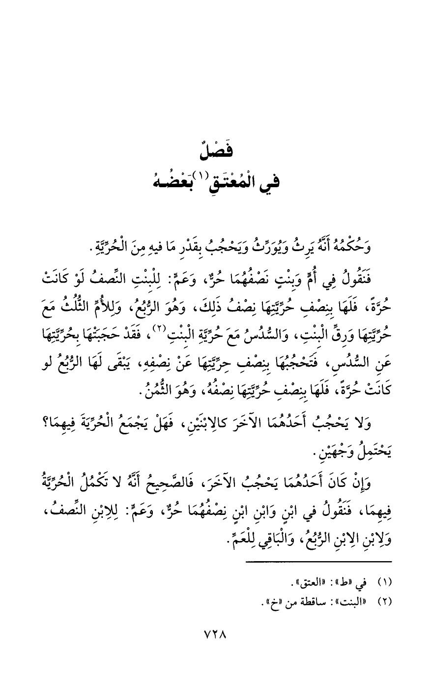 فَنَقُولُ فِي أُمٍّ وَبِنْتٍ نَصْفُهُمَا حُرٌّ، وَعَمٍّ: لِلْبِنْتِ النِّصفُ لَوْ كَانَتْ حُرَّةً، فَلَهَا بِنِصْفِ حُرِّيَّتِهَا نِصفُ ذَلِكَ، وَهُوَ الرُّبُعُ، وَلِلأُمِّ الثُّلُثُ مَعَ حُرِّيَّتِهَا وَرِقِّ الْبِنْتِ، وَالسُّدُسُ مَعَ حُرِّيَّةِ الْبِنْتِ (¬2)، فَقَدْ حَجَبَتْهَا بِحُرِّيَّتِهَا عَنِ السُّدُسِ، فتحْجُبُهَا بِنِصْفِ حِرِّيَّتِهَا عَنْ نِصْفِهِ، يَبْقَى لَهَا الرُّبُعُ لو كَانَتْ حُرَّةً، فَلَهَا بِنِصْفِ حُرِّيَّتِهَا نِصْفُهُ، وَهُوَ الثُّمُنُ.
