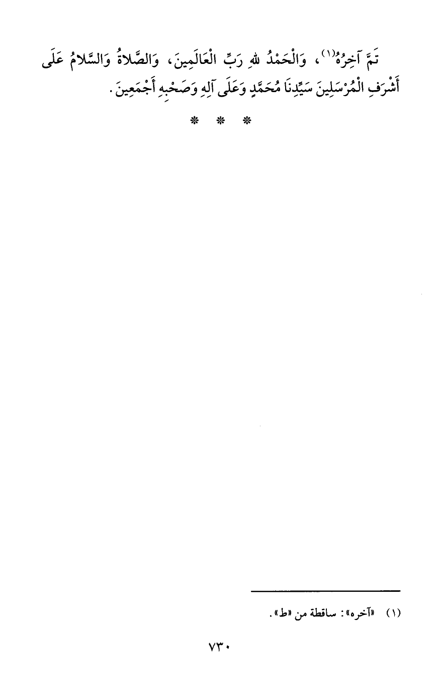 تَمَّ آخِرُهُ (¬1)، وَالْحَمْدُ للهِ رَبِّ الْعَالَمِينَ، وَالصَّلاةُ وَالسَّلامُ عَلَى أَشْرَفِ الْمُرْسَلِينَ سَيِّدِنَا مُحَمَّدٍ وَعَلَى آلِهِ وَصَحْبِهِ أَجْمَعِينَ.