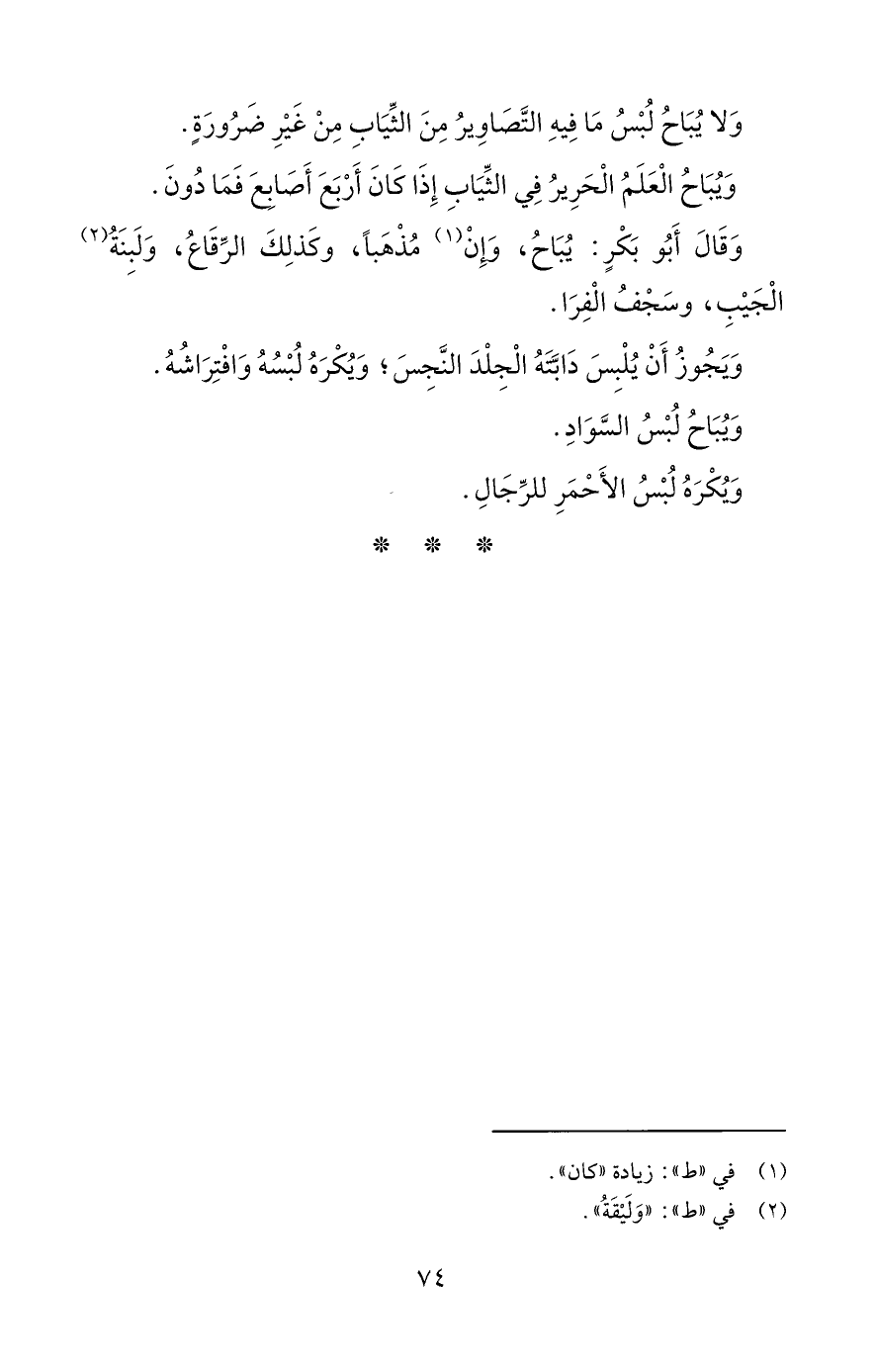 وَلا يُبَاحُ لُبْسُ مَا فِيهِ التَّصَاوِيرُ مِنَ الثِّيَابِ مِنْ غَيْرِ ضَرُورَةٍ.
