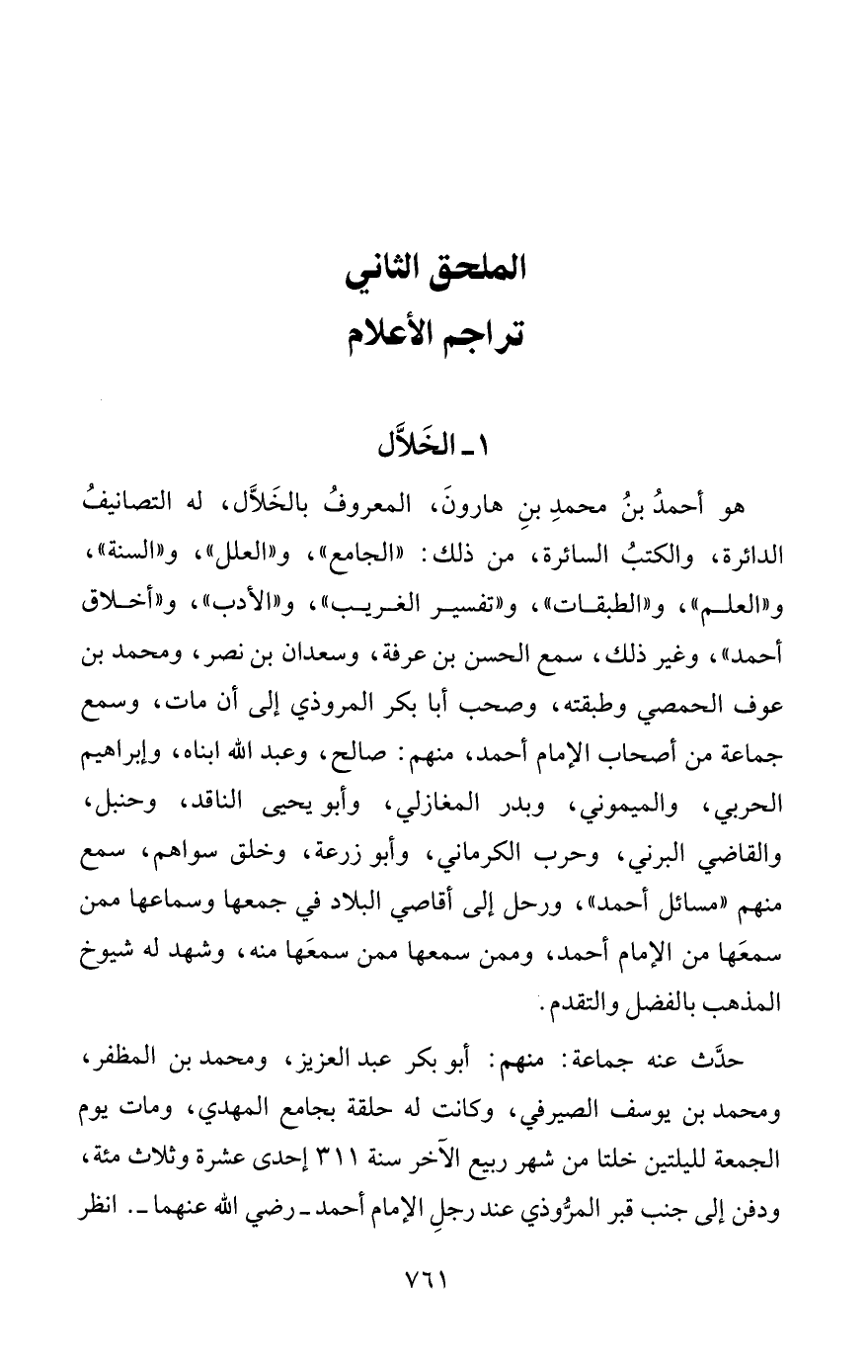 هو أحمدُ بنُ محمدِ بنِ هارونَ، المعروفُ بالخَلَّال، له التصانيفُ الدائرة، والكتبُ السائرة، من ذلك: "الجامع"، و"العلل"، و"السنة"، و"العلم"، و"الطبقات"، و"تفسير الغريب"، و"الأدب"، و"أخلاق أحمد"، وغير ذلك، سمع الحسن بن عرفة، وسعدان بن نصر، ومحمد بن عوف الحمصي وطبقته، وصحب أبا بكر المروذي إلى أن مات، وسمع جماعة من أصحاب الإمام أحمد، منهم: صالح، وعبد الله ابناه، وإبراهيم الحربي، والميموني، وبدر المغازلي، وأبو يحيى الناقد، وحنبل، والقاضي البرني، وحرب الكرماني، وأبو زرعة، وخلق سواهم، سمع منهم "مسائل أحمد"، ورحل إلى أقاصي البلاد في جمعها وسماعها ممن سمعَها من الإمام أحمد، وممن سمعها ممن سمعَها منه، وشهد له شيوخ المذهب بالفضل والتقدم.