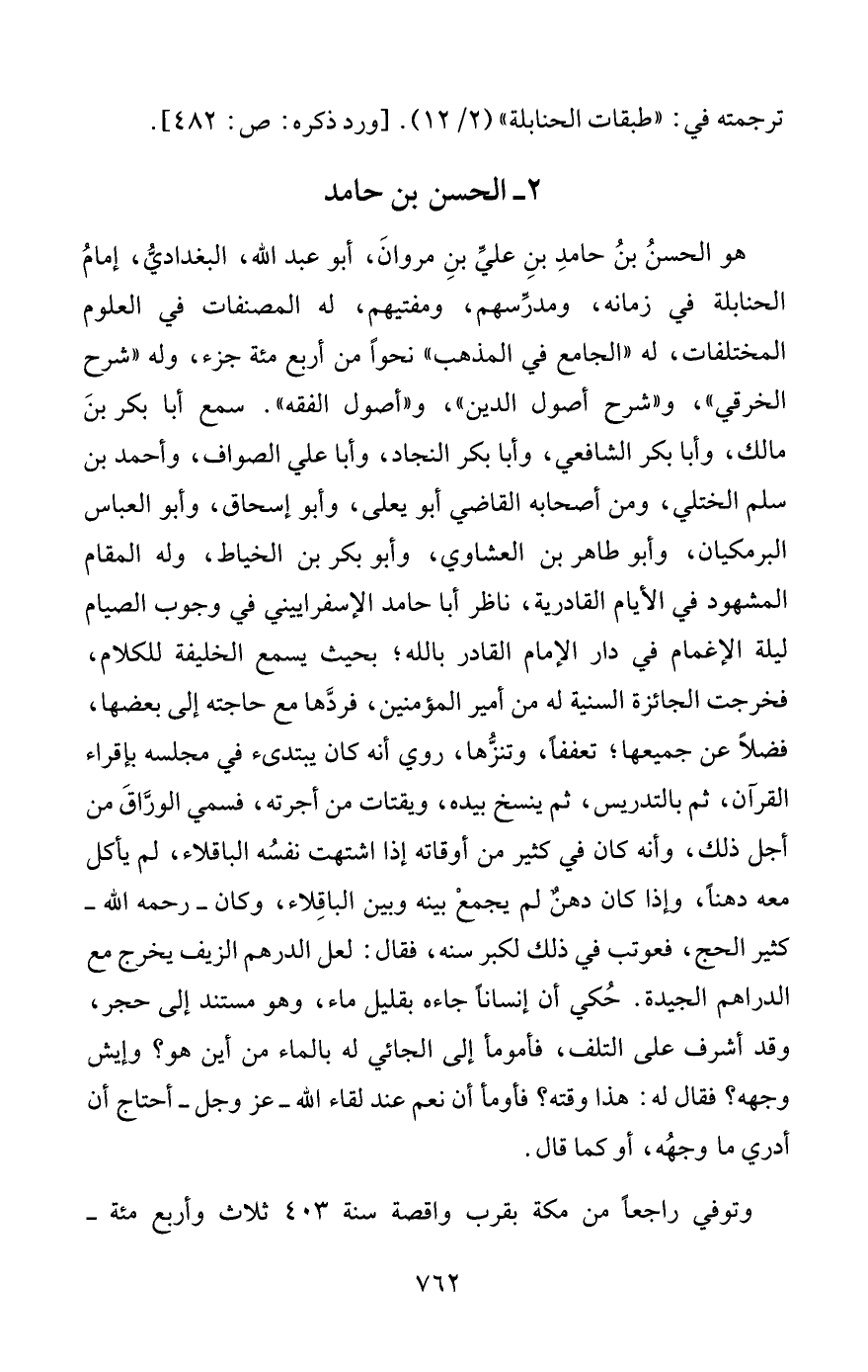 هو الحسنُ بنُ حامدِ بنِ عليّ بنِ مروانَ، أبو عبد الله، البغداديُّ، إمامُ الحنابلة في زمانه، ومدرّسهم، ومفتيهم، له المصنفات في العلوم المختلفات، له "الجامع في المذهب" نحوًا من أربع مئة جزء، وله "شرح الخرقي"، و"شرح أصول الدين"، و"أصول الفقه". سمع أبا بكر بنَ مالك، وأبا بكر الشافعي، وأبا بكر النجاد، وأبا علي الصواف، وأحمد بن سلم الختلي، ومن أصحابه القاضي أبو يعلى، وأبو إسحاق، وأبو العباس البرمكيان، وأبو طاهر بن العشاوي، وأبو بكر بن الخياط، وله المقام المشهود في الأيام القادرية، ناظر أبا حامد الإسفراييني في وجوب الصيام ليلة الإغمام في دار الإمام القادر بالله؛ بحيث يسمع الخليفة للكلام، فخرجت الجائزة السنية له من أمير المؤمنين، فردَّها مع حاجته إلى بعضها، فضلًا عن جميعها؛ تعففًا، وتنزُّها، روي أنه كان يبتدئ في مجلسه بإقراء القرآن، ثم بالتدريس، ثم ينسخ بيده، ويقتات من أجرته، فسمي الورَّاقَ من أجل ذلك، وأنه كان في كثير من أوقاته إذا اشتهت نفسُه الباقلاء، لم يأكل معه دهنًا، وإذا كان دهنٌ لم يجمعْ بينه وبين الباقِلاء، وكان -رحمه الله- كثير الحج، فعوتب في ذلك لكبر سنه، فقال: لعل الدرهم الزيف يخرج مع الدراهم الجيدة. حُكي أن إنسانًا جاءه بقليل ماء، وهو مستند إلى حجر، وقد أشرف على التلف، فأمومأ إلى الجائي له بالماء من أين هو؟ وإيش وجهه؟ فقال له: هذا وقته؟ فأومأ أن نعم عند لقاء الله -عَزَّ وَجَلَّ- أحتاج أن أدري ما وجهُه، أو كما قال.