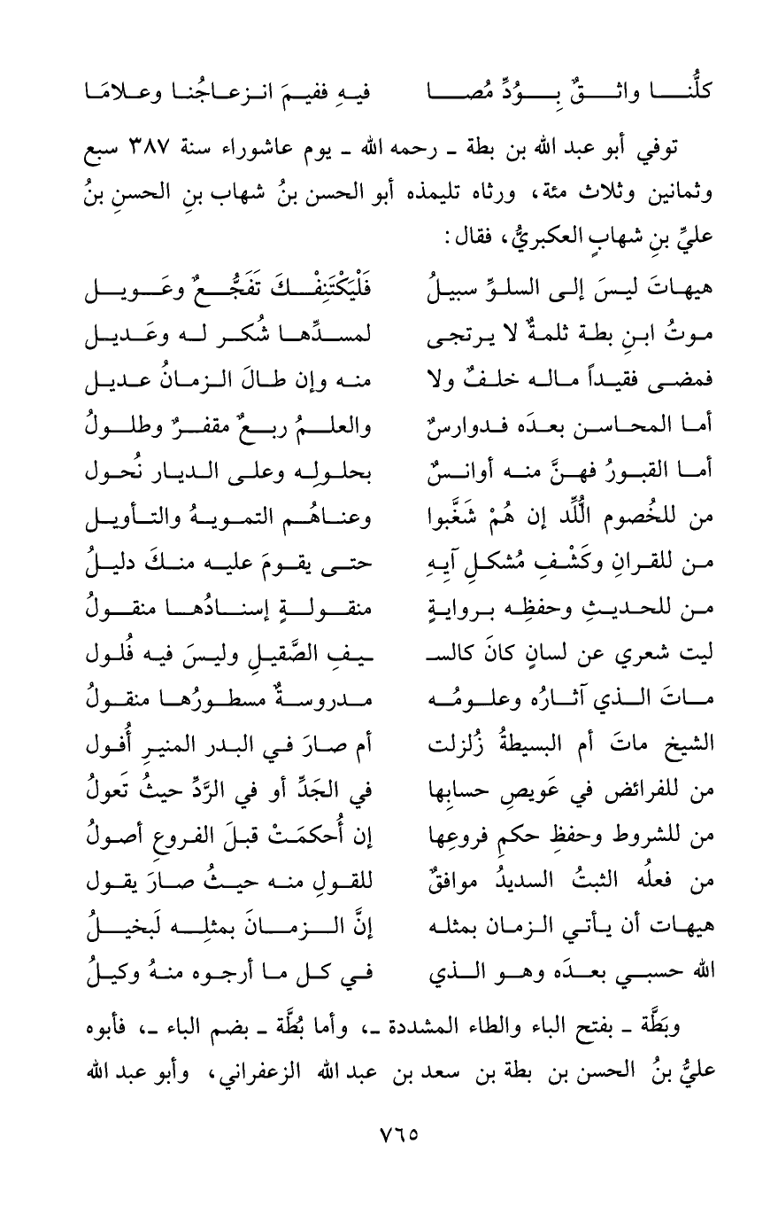 موتُ ابنِ بطة ثلمةٌ لا يرتجى ... لمسدِّها شُكر له وعَديل