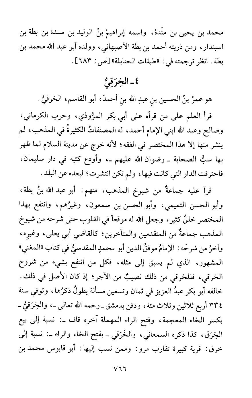 خالفه أبو بكر عبدُ العزيز في ثمان وتسعين مسألة يطولُ ذكرُها، وتوفي سنة 334 أربع ثلاثين وثلاث مئة، ودفن بدمشق -رحمه الله تعالى-، والخِرَقيُّ -بكسر الخاء المعجمة، وفتح الراء المهملة آخره قاف-: نسبة إلى بيع الخِرَق، كذا ذكره السمعاني، والخَرَقي -بفتح الخاء والراء-: نسبة إلى خرق: قرية كبيرة تقارب مرو: وممن نسب إليها: أبو قابوس محمد بن